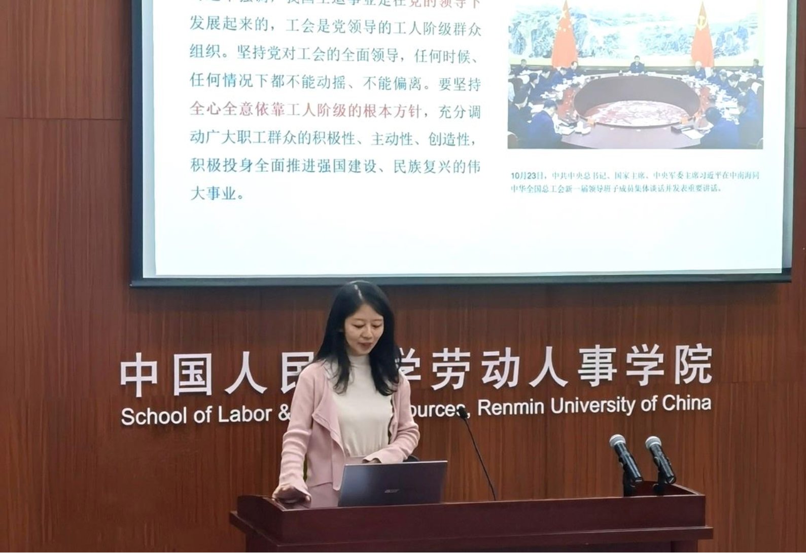 会议伊始,2023级硕士劳动关系班党支部书记龚琳带领与会成员学习了习近平总书记在同全国总工会新一届领导班子成员集体谈话时的重要讲话精神,强调要坚持党对工会的全面领导,组织动员亿万职工积极投身强国建设民族复兴伟业;要大力弘扬劳模精神、劳动精神、工匠精神,培养造就更多大国工匠和高技能人才;要及时了解职工所思所想所盼,不断增强服务职工本领,真心实意为职工说话办事。