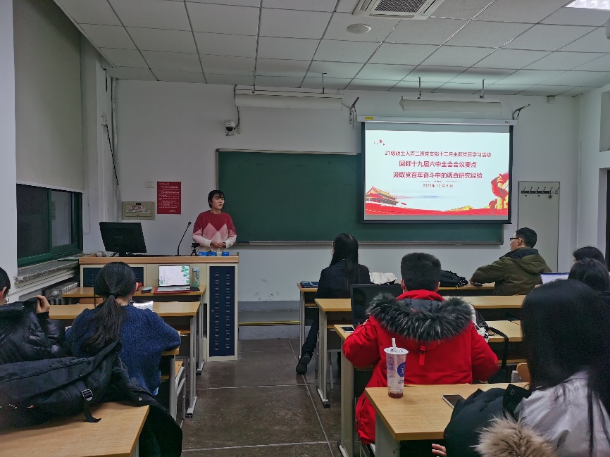 12月8日晚,太阳成tyc122cc集团2021级硕士人力资源管理二班党支部在公教二楼2217教室召开了以“回顾十九届六中全会会议要点,汲取党百年奋斗中的调查研究经验”为主题的党日活动。本次会议邀请支部理论指导老师刘松博作指导,并邀请了马克思主义公司博士宣讲团的讲师进行讲解,支部党员、积极分子参与了本次学习,其他支部骨干前来交流调研。