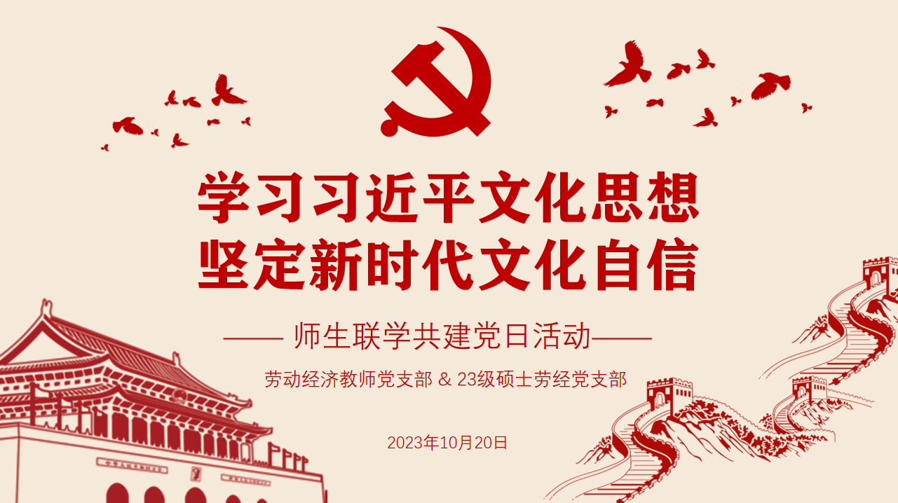 2023年10月20日下午,劳动经济系党支部联合2023级硕士劳动经济班党支部,在求是楼120室“党员之家”开展“学习习近平文化思想,坚定新时代文化自信”主题党日活动。本次活动由2023级硕士劳动经济班党支部书记孙孟哲主持,劳动经济系党支部书记赵丽秋老师、党员易定红老师、葛玉好老师、林琳老师及2023级硕士劳动经济班党支部党员共同参加。