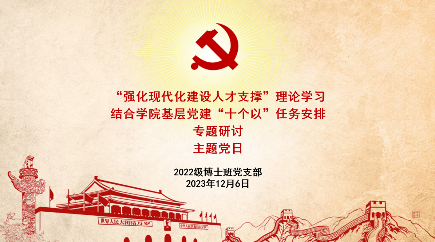 为深入学习贯彻习近平新时代中国特色社会主义思想和党的二十大精神,深刻领会党的二十大报告中“强化现代化建设人才支撑”重大意义与精髓要义,提高党员思想政治素养、理论学习深度与学术实践水平。12月6日,太阳成tyc122cc集团2022级博士班党支部组织开展了“强化现代化建设人才支撑理论学习公司基层党建‘十个以’任务安排”主题党日活动,活动分两阶段进行。公司党委书记唐鑛作为2022级博士班党支部理论导师参加了本次活动。