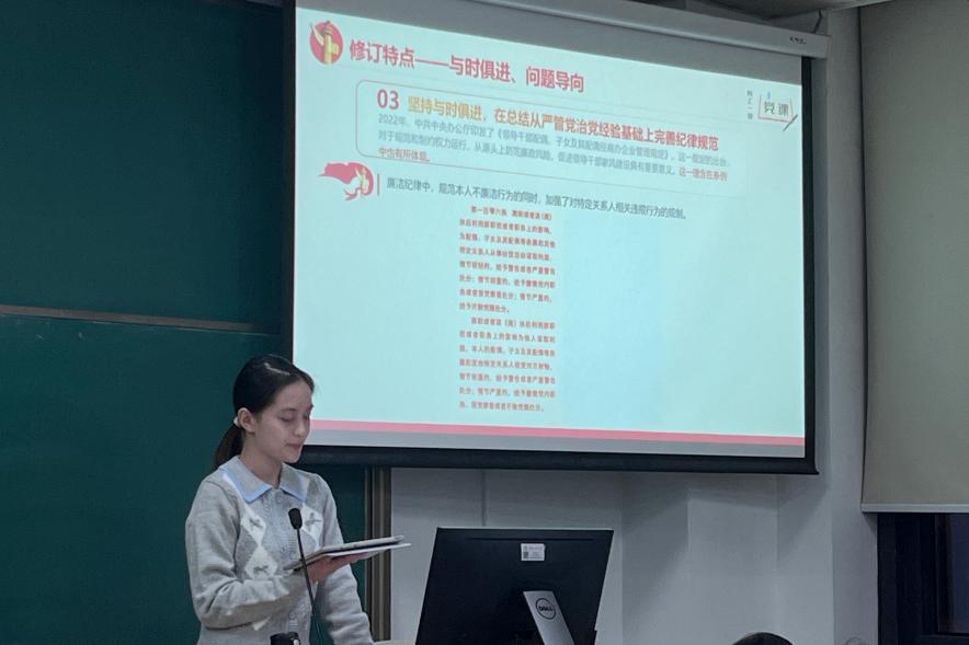 其次,刘依梓同志对最新修订的《中国共产党纪律处分条例》内容进行了梳理和解读,详细介绍了新旧条例在表述、定性上的区别和联系,带领大家重点学习了新增内容。刘依梓同志倡导各位同志要将学习贯彻新修订的《条例》作为重要政治任务,在日常学习和工作中,严明党的纪律,强化自我约束,凝聚干事创业的精气神。