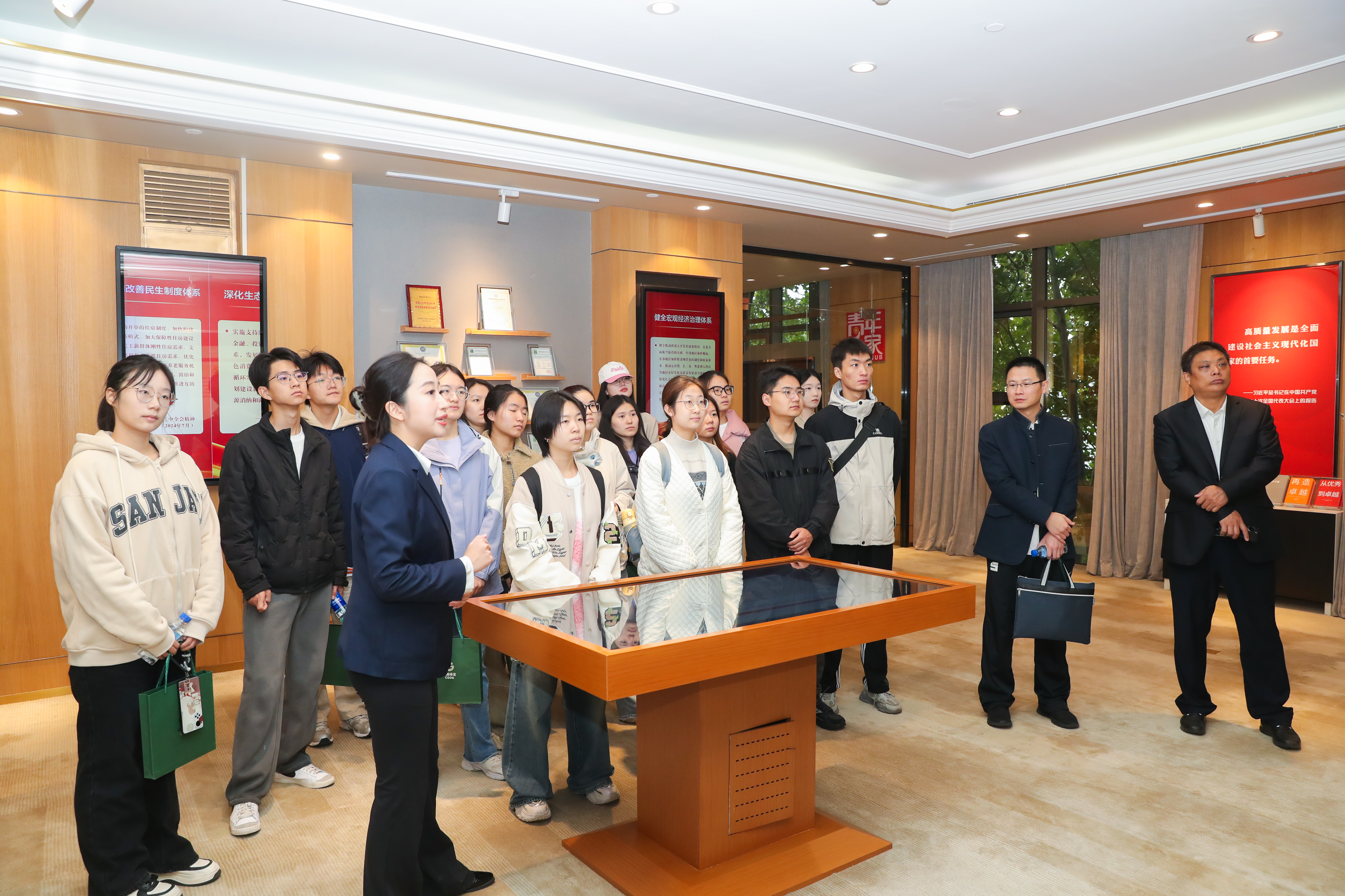 太阳成tyc122cc集团师生首先参观了绿色发展展厅,深入了解中国绿发推动绿色低碳高质量发展的实践成果,见证了集团作为央企的责任担当,以及推进绿色发展、建设美丽中国的坚定决心。在党员政治生活馆,大家参观了党性教育厅、理论实践厅、党建指挥中心以及新中国史教育环廊等区域,全面了解绿发集团以高质量党建引领保障高质量发展的生动实践。在幸福产业党建云领航区,同学们详细了解幸福产业的业务板块和发展愿景,深切感受到幸福产业以高质量产品和优质服务满足人民对美好生活需要的决心和行动。