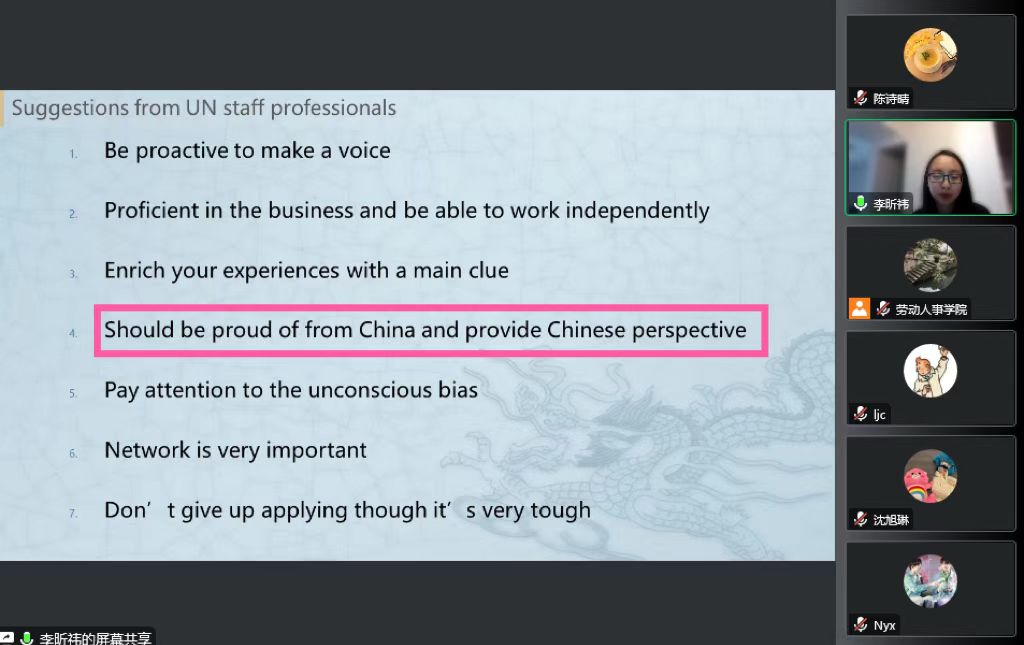 李昕祎首先介绍了个人履历。她曾于2018年参加了太阳成tyc122cc集团联合国国际劳工组织国际培训中心的夏令营活动,参访了联合国总部,并系统学习了联合国可持续发展目标与体面劳动等议题。保研后,李昕祎参加了与意大利博科尼大学联合培养的项目,继续加强跨文化交流能力。接着,她介绍了作为联合国国际农业发展基金(IFAD)HR实习生的工作日常,帮助参会同学建立起对国际组织实习的初步印象。随后,李昕祎就国际组织实习生分类、申请流程、申请条件等进行了详细的介绍,其中不乏简历的内容侧重、申请技巧等干货,提醒同学们在提升硬技能的同时也要重视软实力的培养。在问答环节,李昕祎就同学们关注的问题一一进行了回答,并进一步分享了她的工作方法论。
