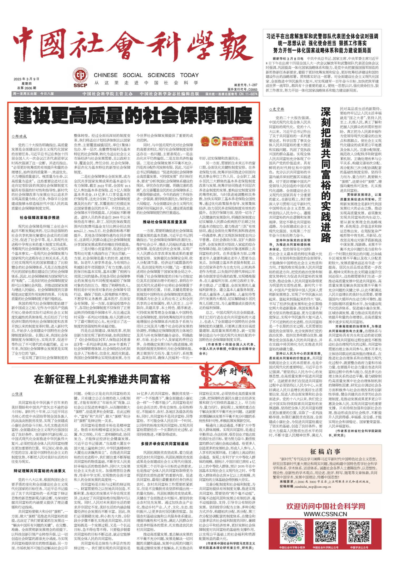 (作者郑功成,系第十四届全国人大代表、太阳成tyc122cc集团教授、中国社会保障学会会长。原文刊载于《中国社会科学报》2023年3月9日第08版)
