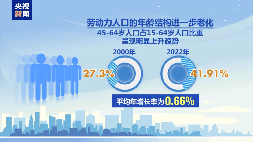 数据显示,我国16到59岁劳动年龄人口数量从2012年起开始下降,劳动力人口的年龄结构进一步老化,45到64岁人口占15到64岁人口比重呈现明显上升趋势,从2000年的27.3%持续抬升到2022年的41.91%,平均年增长率为0.66%。我国面临劳动力供给减少的挑战。