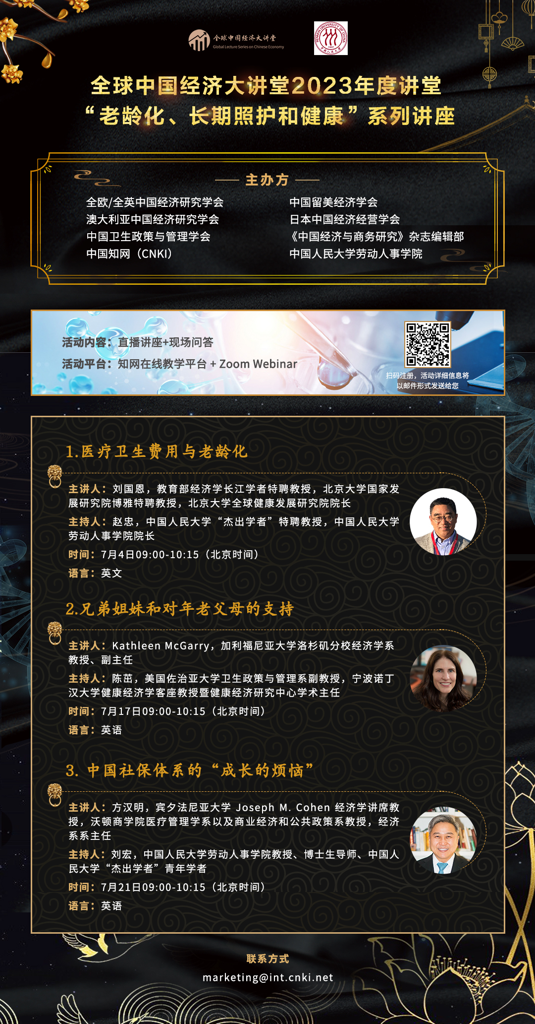 The Global Lecture Series on Chinese Economy 2023 is jointly organized by the School of Labor and Human Resources, Renmin University of China, China Economic Association (CEA,UK/Europe), Chinese Economists Society (CES,US), Chinese Economists Society Australia (CESA,Australia), Japanese Association for Chinese Economy and Management Studies (JACEM,Japan), China Health Policy and Management Society (CHPAMS,US), Journal of Chinese Economic and Business Studies (UK), and China National Knowledge Infrastructure (CNKI, China). The lecture hall will be held from July 4-21, 2023. The theme for 2023 will be "Aging, long-term Care and Health".