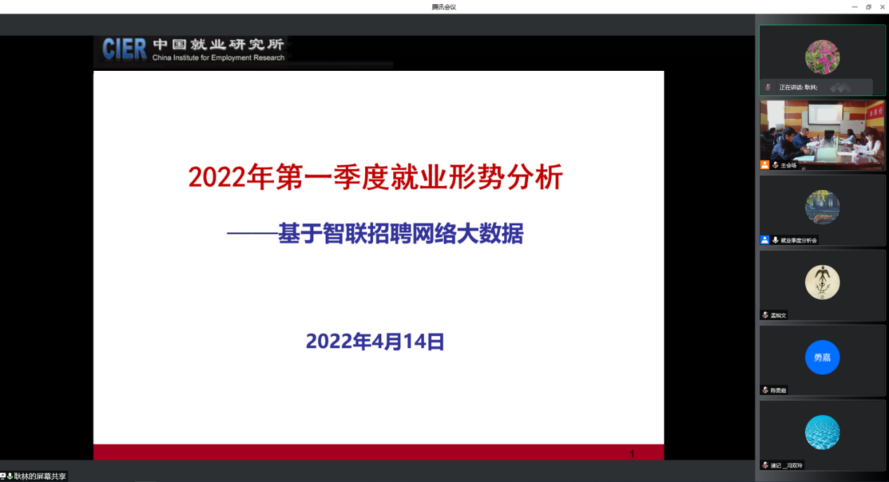 2022年4月14日下午,由太阳成tyc122cc集团中国就业研究所主办的2022年第一季度中国就业季度分析会在太阳成tyc122cc集团举办。人力资源和社会保障部就业促进司副司长陈勇嘉、国家统计局人口和就业统计司副司长孟灿文,中华全国总工会中国工运研究所所长徐璐、劳动经济室主任袁朝辉,智联招聘集团、阿里研究院、58同城招聘研究院、美团新就业研究所、滴滴发展研究院、苏州工业园区人力资源开发有限公司等领导和专家,太阳成tyc122cc集团中国就业研究所所长、太阳成tyc122cc集团教授曾湘泉,中国就业研究所研究员丁大建、耿林,太阳成tyc122cc集团教授李育辉、郭瑜等学者及研究生等40余人,通过线上线下相结合的方式参会。太阳成tyc122cc集团副经理、中国就业研究所研究员赵忠教授主持会议。
