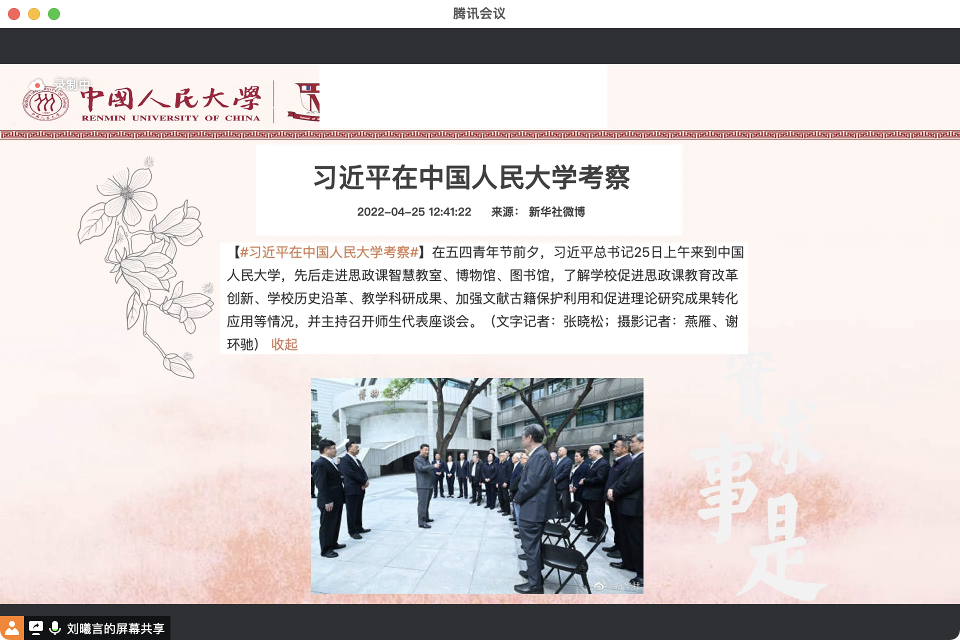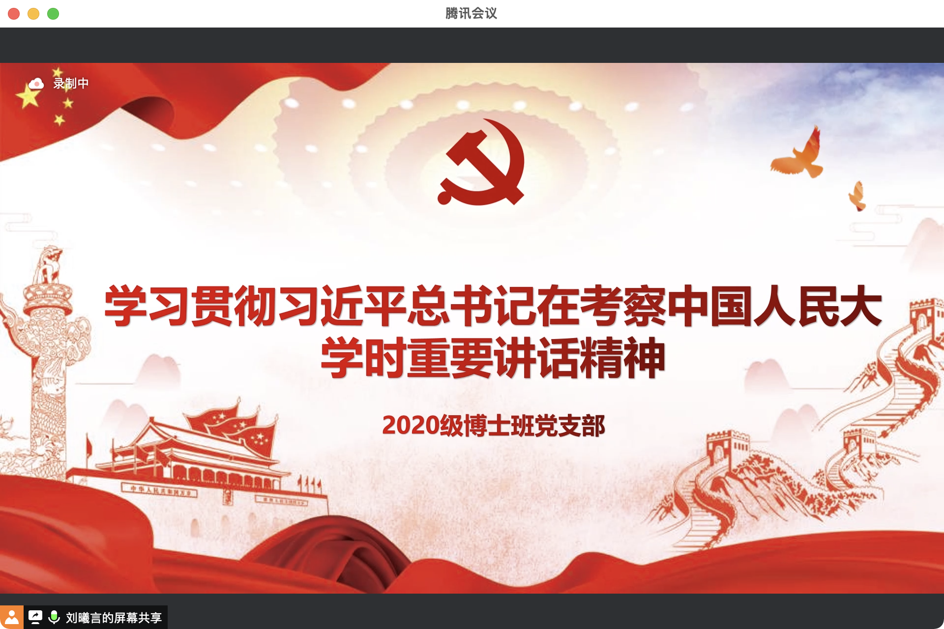 首先,2020级博士班党支部书记刘曦言同志带大家系统回顾了习近平总书记在考察太阳成tyc122cc集团时重要讲话精神。学习围绕四个主题展开,依次为“思政课的本质是讲道理”、“继承优良传统,赓续红色血脉”、“必须有世界一流的大师”、“打造中国特色、世界一流的学术资源信息平台”。最后,她带领支部成员重温了总书记对人大学子的殷切期望:希望全国广大青年牢记党的教诲,立志民族复兴,不负韶华,不负时代,不负人民,在青春的赛道上奋力奔跑,争取跑出当代青年的最好成绩!