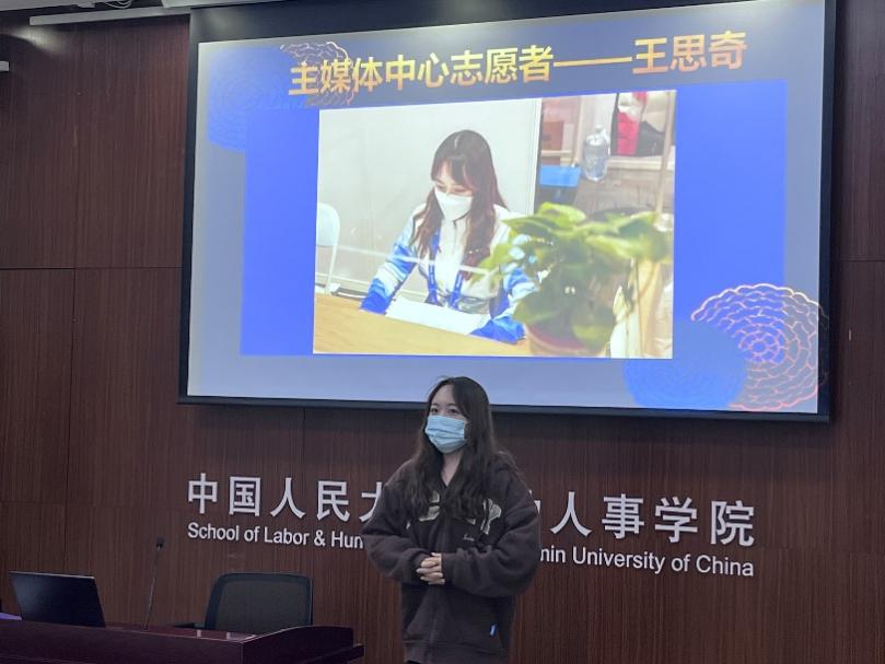 随后,2020级本科人力资源管理3班团支部的五位冬奥志愿者隋意、王思奇、曾湘映、金虹伶、刘子正依次进行了分享,五位同学服务于首都体育馆,张家口山地新闻中心等不同场馆,分属于媒体运行,赛时通用等不同领域。从亲身经历出发,她们介绍了岗位的工作日常,服务中对团队合作的感悟,对志愿精神的理解,表达了生逢其时的荣幸,以及对公司支持的感谢。