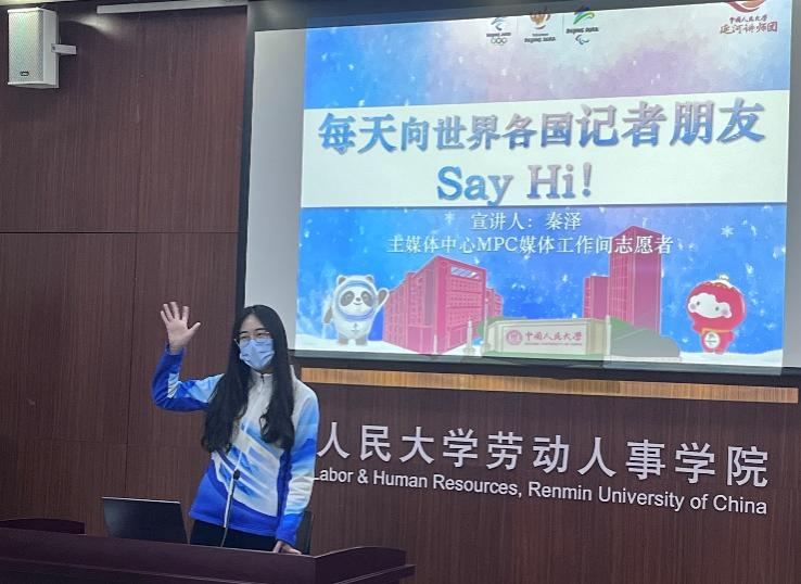 秦泽带来了题为《每天向各国记者朋友sayhi》的宣讲,分享了她在主媒体中心服务中的所见与所思。秦泽提到了让她印象最为深刻的一次经历,在一次比赛后她亲眼目睹了记者们在雪地上席地而坐赶稿子,记者们的敬业精神深深感染了她,也让她对新闻的时效性有了更加深入的理解。在场同学们专注听讲,积极互动交流。