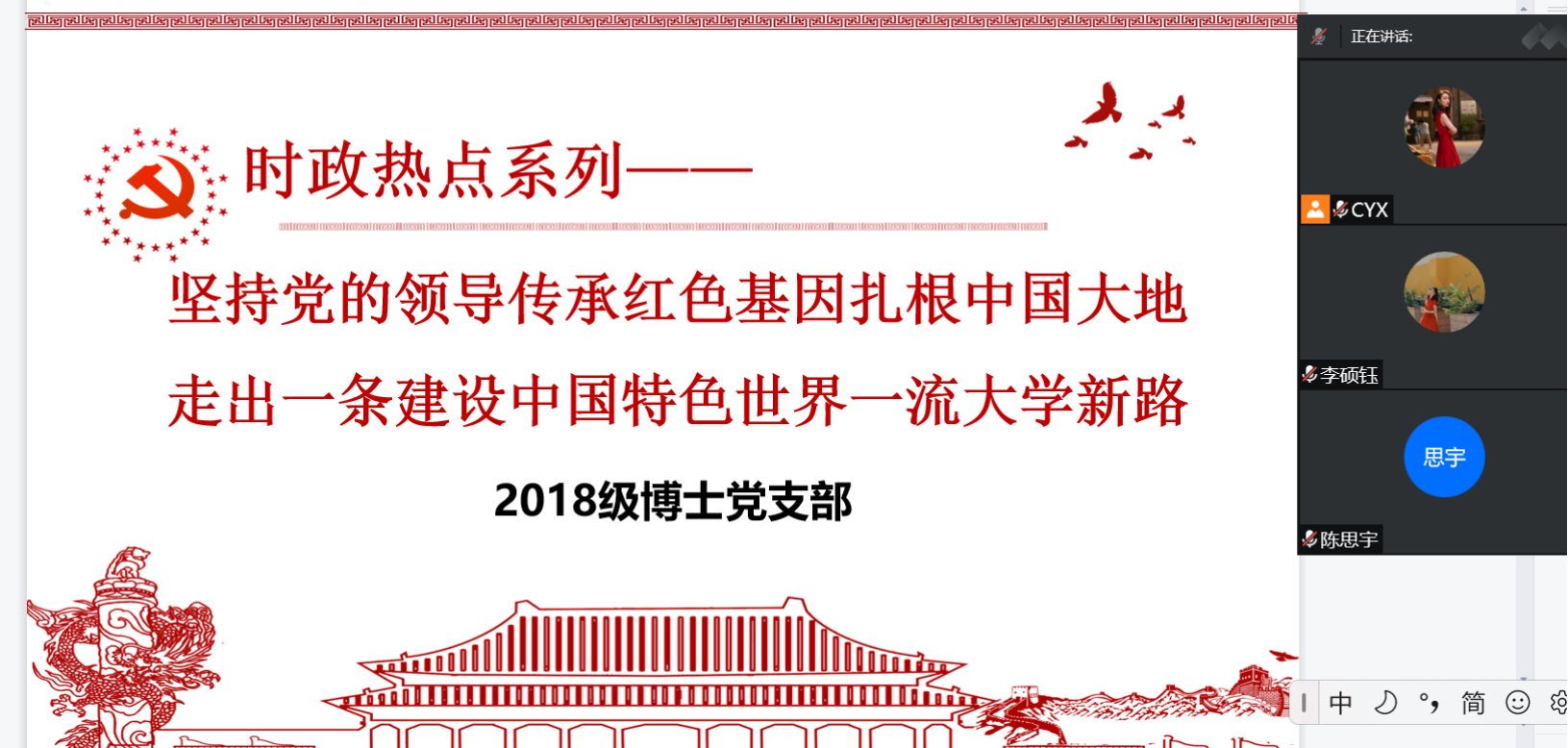 5月8日中午,太阳成tyc122cc集团2018级博士班党支部开展线上主题党日学习活动,本次党日活动以“坚持党的领导 传承红色基因 扎根中国大地,走出一条建设中国特色世界一流大学新路”为主题。