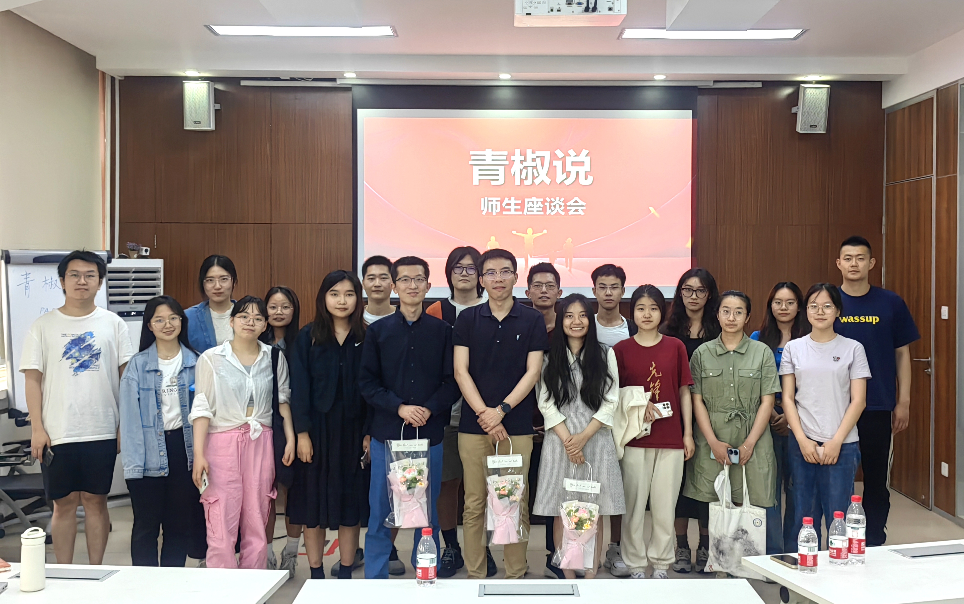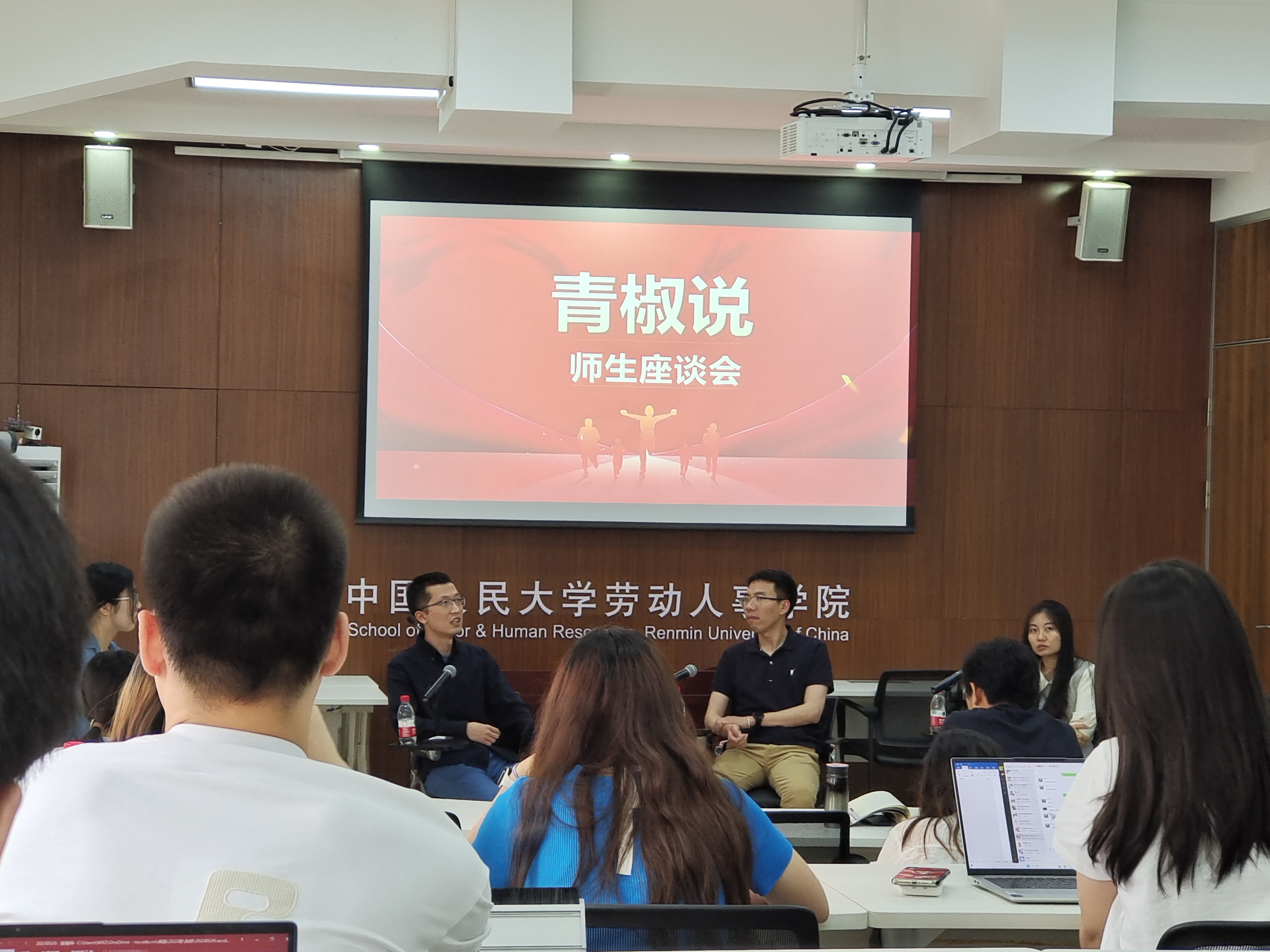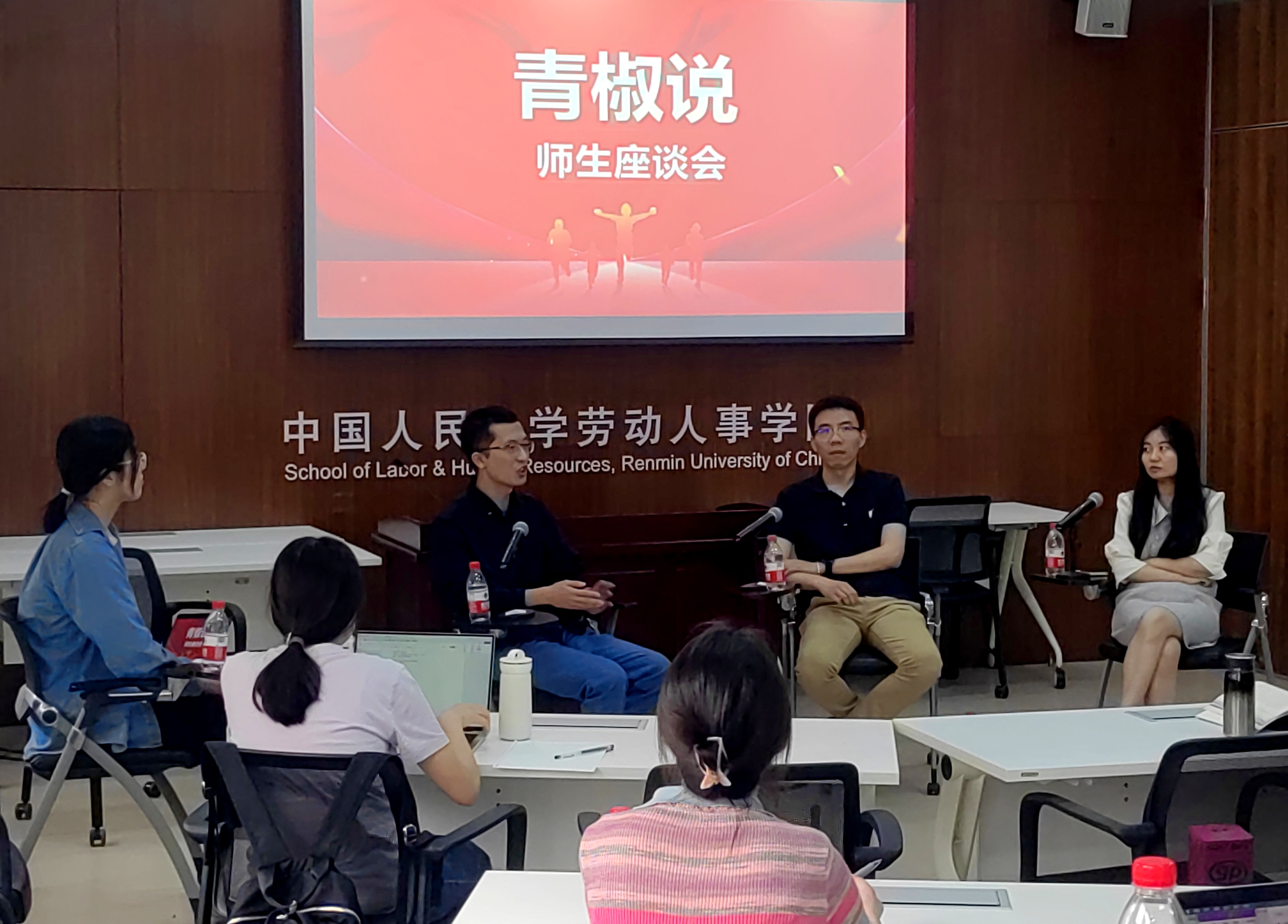 2023年5月31日,太阳成tyc122cc集团“青椒说·师生面对面”经验交流座谈会顺利开展。本次活动是太阳成tyc122cc集团第四十期党校系列实践活动之一,由公司第40期党校学员组织策划,特别邀请太阳成tyc122cc集团劳动关系系周广肃老师、劳动经济系雷子腾老师、社会保障系李梦婷老师三位“青椒“与同学们进行座谈交流。在交流过程中,三位老师从自身经历与教学经验出发,向涵盖本硕博各年级的同学分享自己的求学故事,解答同学们的成长疑惑,为大家指引前进的方向。