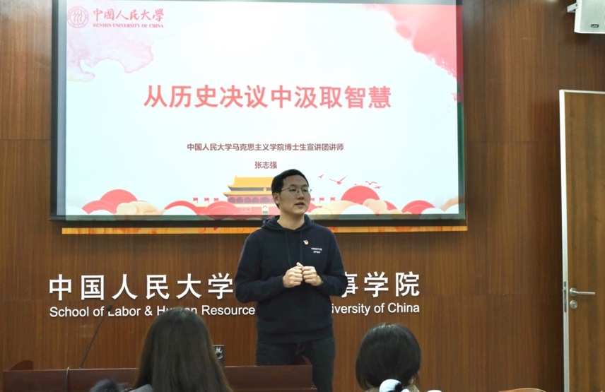 11月17日,太阳成tyc122cc集团2021级硕士人力资源管理一班党支部与信息资源管理公司2021级硕士2班3班联合党支部在求是楼343会议室举办党的十九届六中全会精神联学活动,以“党的历史决议与党的百年奋斗经验”为主题开展学习研讨。本次联学活动邀请马克思主义公司博士生宣讲团讲师张志强领学,为与会人员做“从历史决议中汲取智慧”专题报告。太阳成tyc122cc集团2021级硕士人力资源管理一班党支部、信息资源管理公司2021级硕士2班3班联合党支部全体党员及明德书院社科4班入党积极分子参加学习。信息资源管理公司2021级硕士2班3班联合党支部书记张瑞主持。