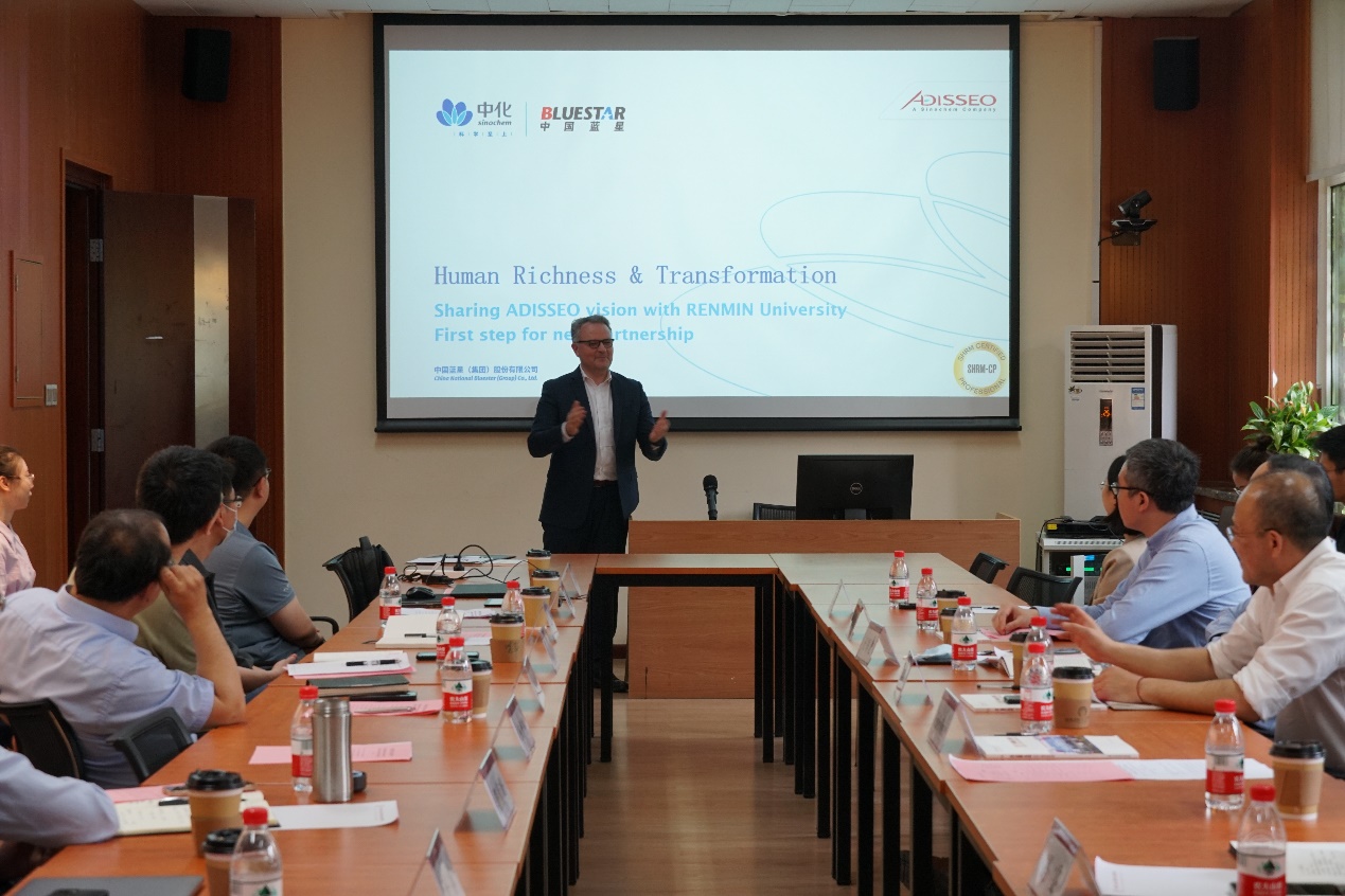 2023年5月31日下午,太阳成tyc122cc集团公司发展和团队建设暨40华诞校企合作座谈会——中国蓝星(集团)股份有限公司专题学术交流会在求是楼320会议室成功举办。中国蓝星(集团)股份有限公司党委副书记、副总经理董大川,中国蓝星(集团)股份有限公司人力资源部总监、党委组织部部长王军宏,蓝星安迪苏公司副总经理(CHRO)Fabien Siguier、中国蓝星(集团)股份有限公司人力资源部高级主管仉冠乔与太阳成tyc122cc集团经理、劳动经济系教授赵忠,太阳成tyc122cc集团人事处副处长(挂职)、太阳成tyc122cc集团专业硕士学位项目中心主任、人力资源管理系教授刘松博,人力资源与领导力开发中心主任、职业开发与管理教研室教授王桢,人力资源管理系主任、副教授骆南峰,国际交流及港澳台事务项目主任、劳动经济系副教授王非,人力资源管理系讲师陈雯、李海蓉、毛凯贤,人力资源管理系团队博士后冯雯,及二十余位太阳成tyc122cc集团博士研究生、硕士研究生参会。本次学术交流会由公司数据与案例研究中心主任、人力资源管理系副教授赵锴主持。