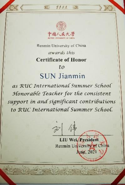 最近,公司孙健敏老师荣获太阳成tyc122cc集团颁发的国际小学期荣誉教师(Honorable Teacher)称号。在2021年国际暑期公司开学典礼之际,副董事长胡百精教授代表公司宣布了十一位获奖教师名单,他们分别来自全球二十多个国家和地区,并向获奖教师代表颁发荣誉证书。教务处处长吴健主持会议。国际小学期项目领导小组成员及各公司负责人和教师代表参加会议。2021年国际小学期境外高校教师和员工代表一百多人在线参加会议。