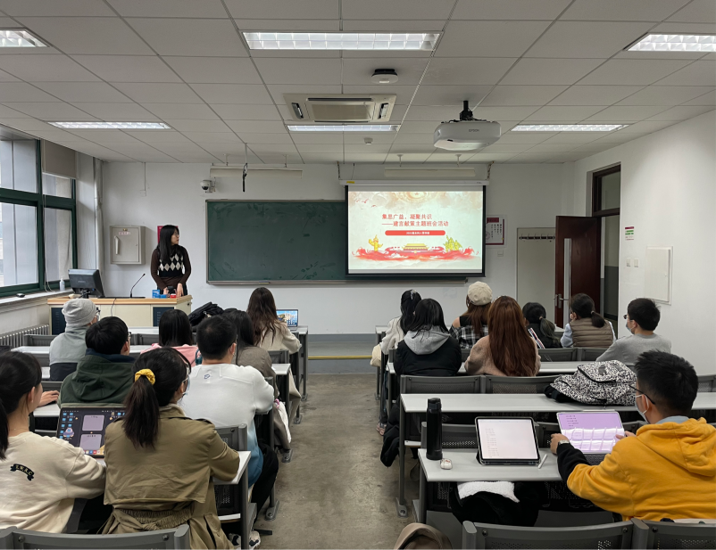 班级辅导员贾思淼介绍了“建言献策”活动的具体要求。她鼓励同学们积极参与本次建言献策活动,围绕“培养什么人、怎样培养人、为谁培养人”这一根本问题,从加强和改进公司党的领导和党的建设、加强师生思想政治工作、落实立德树人根本任务、推进“双一流”建设、内部建设与管理、社会服务与合作交流以及提升师生员工满足感获得感幸福感等方面进行深入思考,开展讨论。