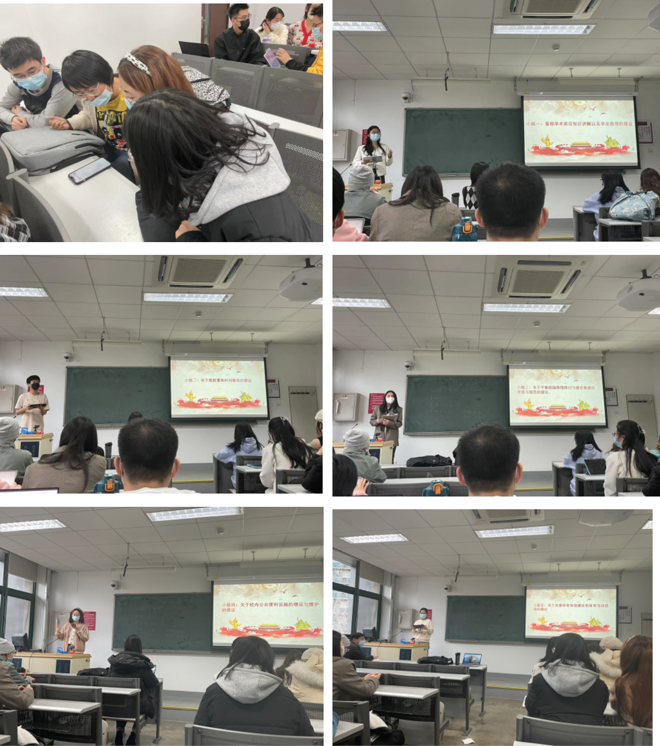 随后,同学们围绕不同议题,分成五个小组,积极展开讨论。讨论结束后,各组同学派代表发言,分别提出了关于学术学业指导、课表时间安排改进、校内公共便利设施的增设与维护、宣传教育工作、完善体育场馆建设和丰富体育活动等方面的建议。