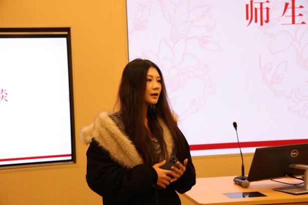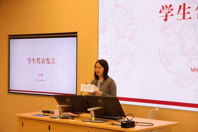 MHR专硕班员工代表卢果同学结合入学以来的学习经历,深情回顾了自身成长与收获。她以与孙军、余清泉、杨征等校外导师交流互动的真实故事为例,生动讲述了来自业界导师的悉心指导和启发帮助,建议师弟师妹们珍惜MHR项目提供的“双导师”资源优势,主动加强与导师的沟通交流,在实践中明确发展方向、完善职业规划,走好专业成长的每一步。