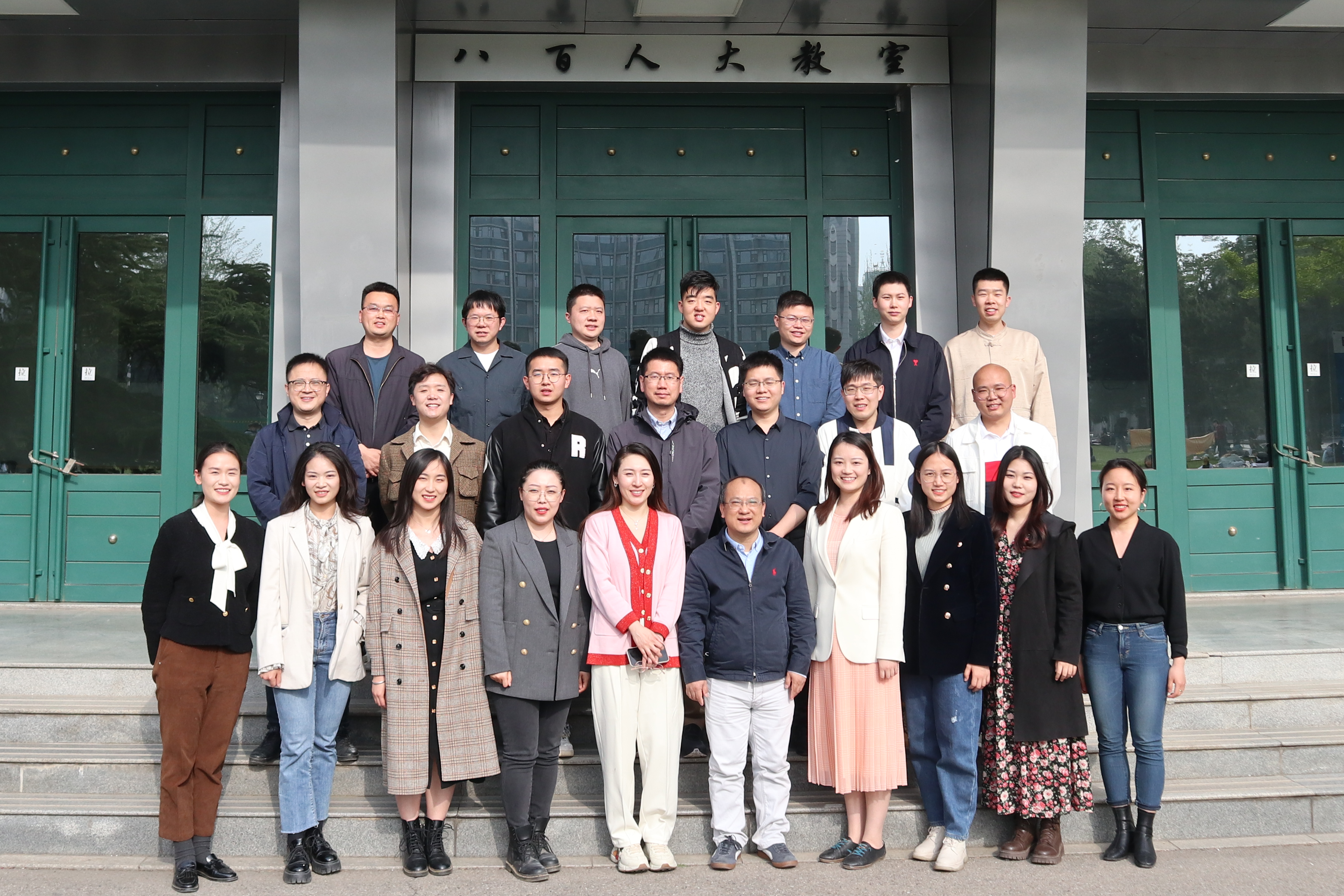 (与会师生员工代表在八百人大教室前合影留念)