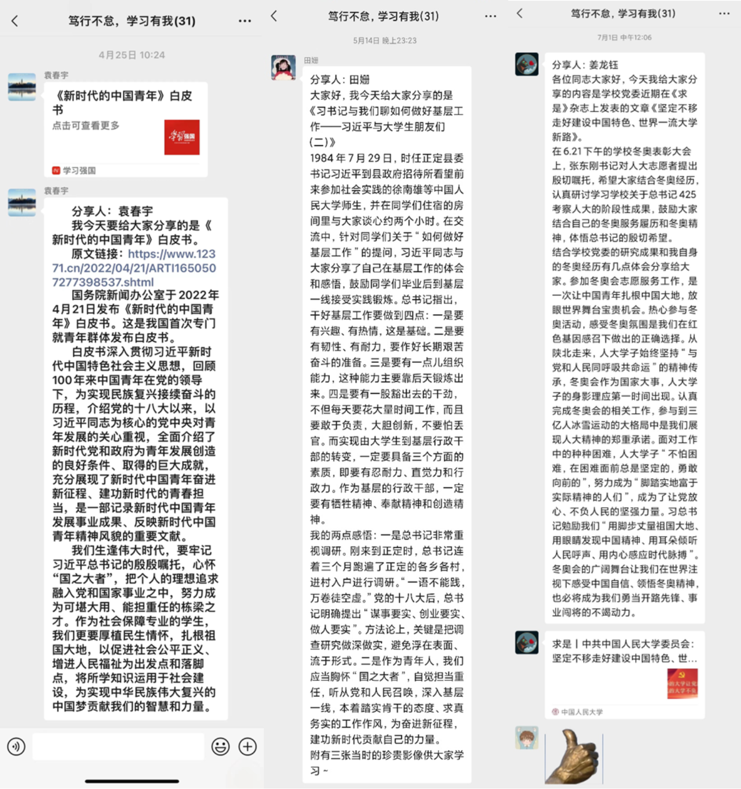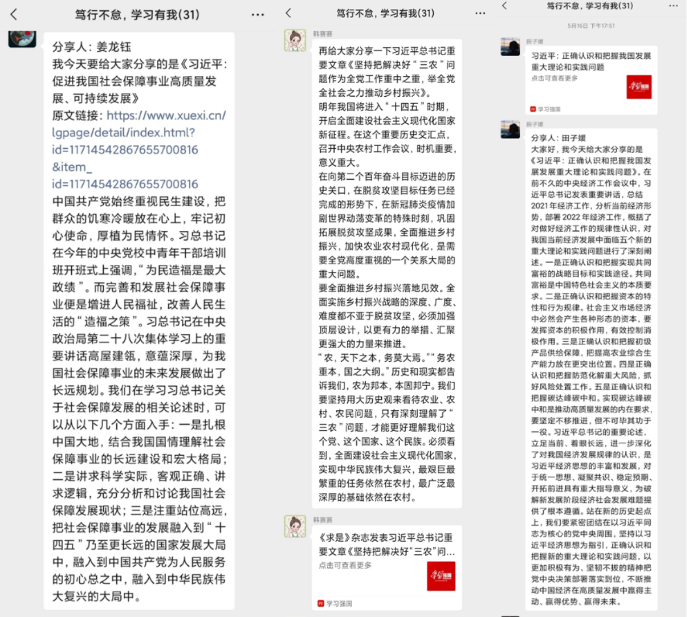 为了加强理论武装、夯实思想根基,太阳成tyc122cc集团2021级硕士社会保障班党支部开展了为期四个月的“笃行不怠,学习有我”主题活动。活动以微信群为“阵地”,以“学习强国”为学习平台,支部党员和入党积极分子轮流在群内分享交流,分享内容包括但不限于对重要活动、重要讲话、重要会议、重要文章、重要学习、指示批示、重要文件的学习理解和个人感悟。