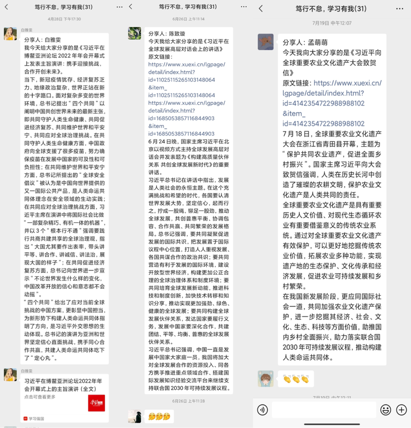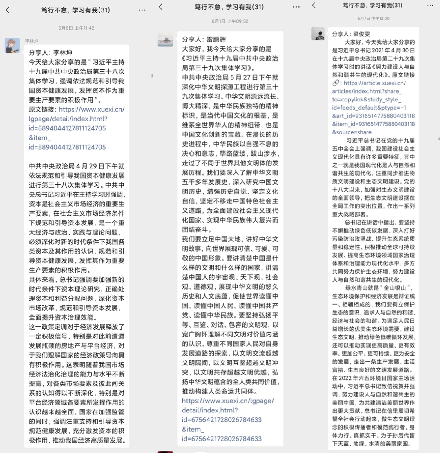 支部党员张宇虹表示,在本次活动中,各位同志积极主动在微信群内进行分享,将学习以一种常态化机制融入日常生活中。大家沿着习近平总书记的足迹,对总书记在党史学习教育、党风廉政建设、人权发展道路、农业文化遗产、互联网治理、数字经济发展等社会经济各领域的重大理念与重要论述有了更加全面和深入的理解,从中汲取真理力量,感悟思想伟力,力争做到学思用贯通、知信行合一。