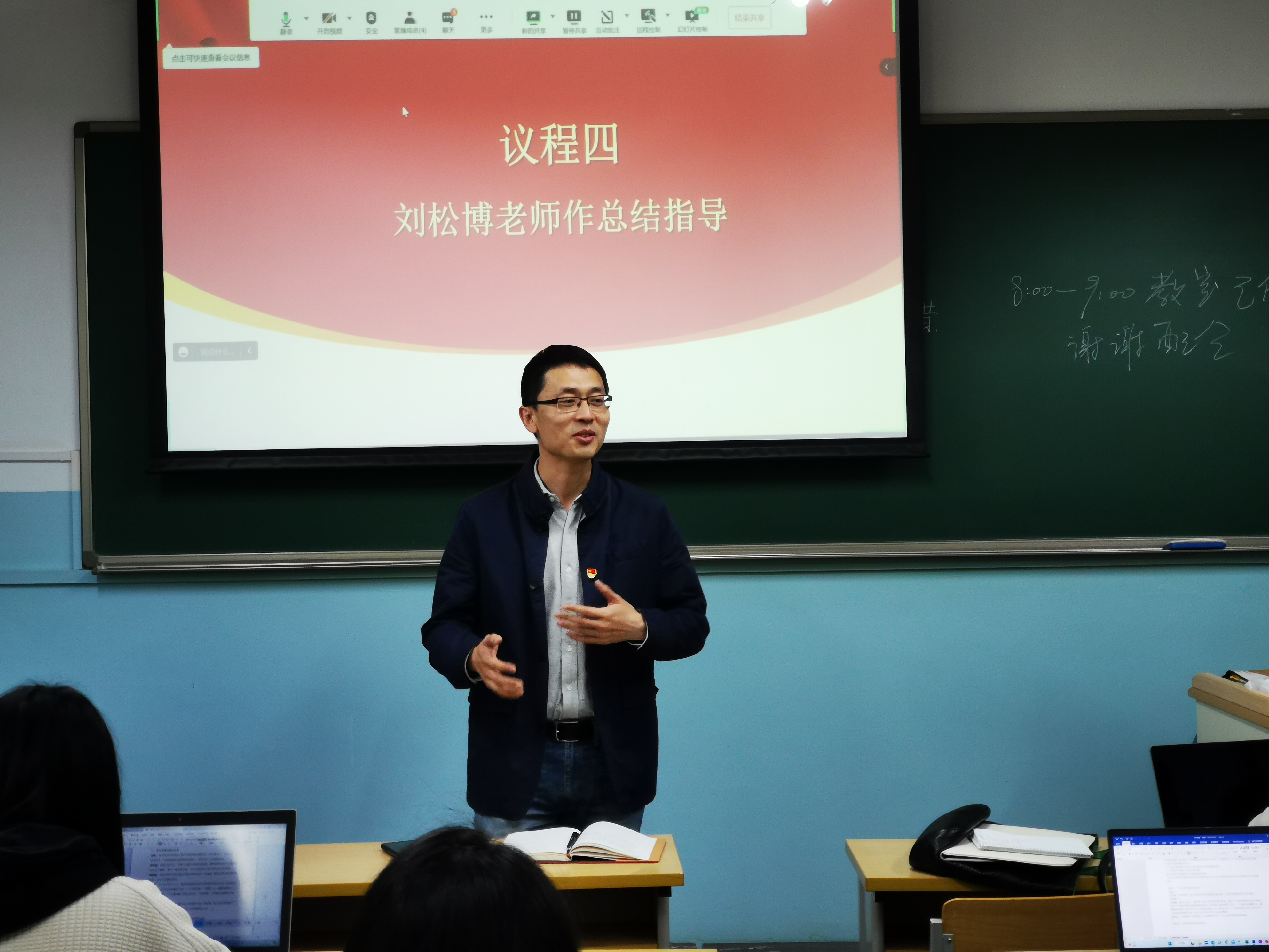 在会议的结尾,金铭指出,国家、社会、民族伟大的新征程已经开启,崭新的蓝图已然绘就,青春奋进正当时,号召支部同志迎着国家、社会和人民的期待,争做复兴栋梁、强国先锋。