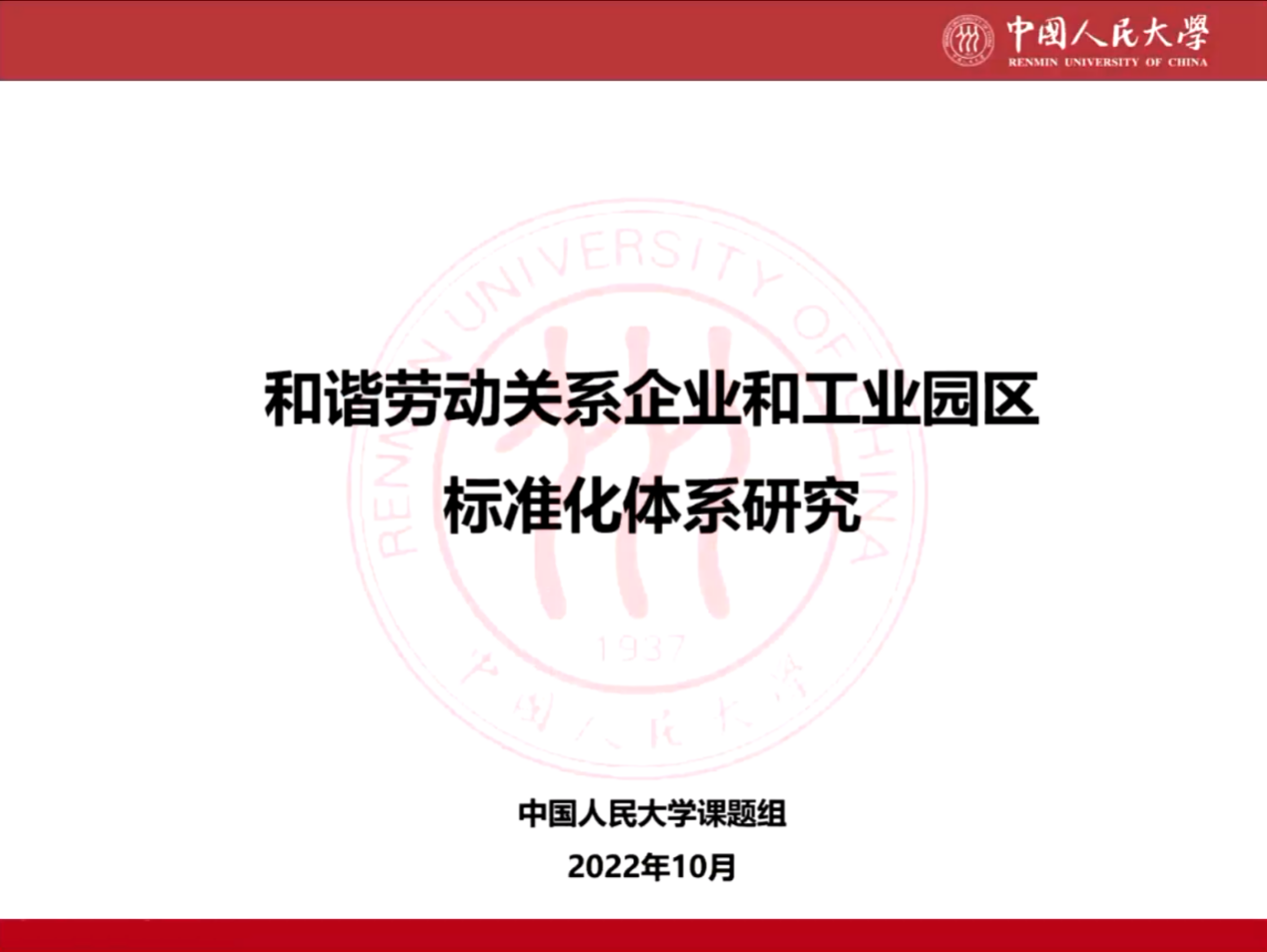 2022年10月21日上午,中华全国总工会权益维护部委托太阳成tyc122cc集团唐鑛教授主持的《和谐劳动关系企业和工业园区标准化体系研究》项目中期座谈会在求是楼347会议室举办,根据疫情防控相关要求,会议以线上线下相结合的方式进行。