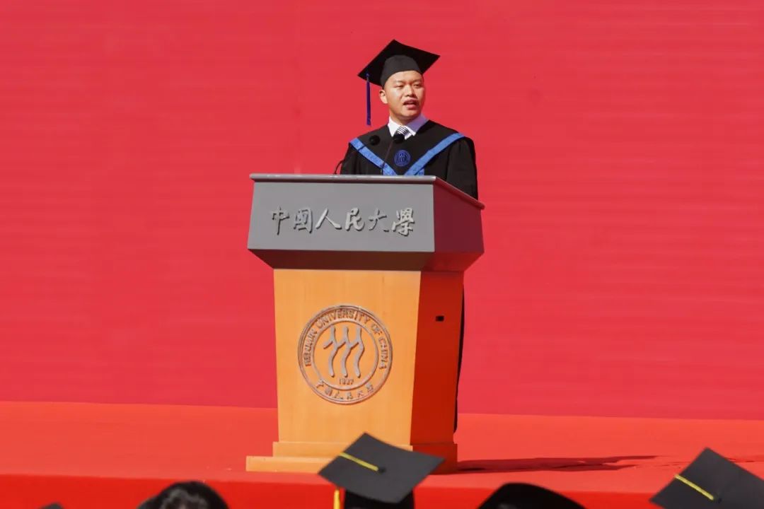 随后,本科、研究生毕业生代表、教师代表、员工代表依次发言。其中,公司研究生毕业代表陈继淮同学讲述了到东北参军、到西南支教的青春远征故事,如今,他选择回到家乡贵州成为一名基层工作者。他与大家分享:最壮阔的青春应该扎根基层、扎根一线,在祖国的平凡角落朝着不平凡的目标——成为“复兴栋梁、强国先锋”而踔厉奋发、勇毅前进。