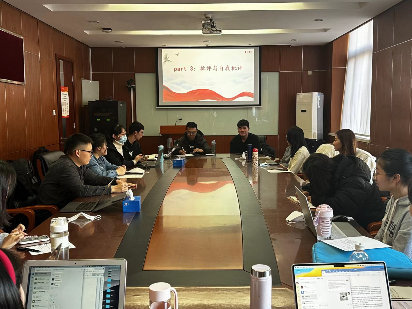 首先,支部书记吴潇从组织建设、支部系列活动、工作经验与不足三个方面对2022年支部工作进行总结。支部全体全体成员团结协作、积极进取,支部建设成效显著,但同时也存在支委经验尚浅、工作流程不清等不足。接着,支委会带领支部成员共同查摆了工作效率、时间安排、工作执行力、活动效果四个方面存在的问题。