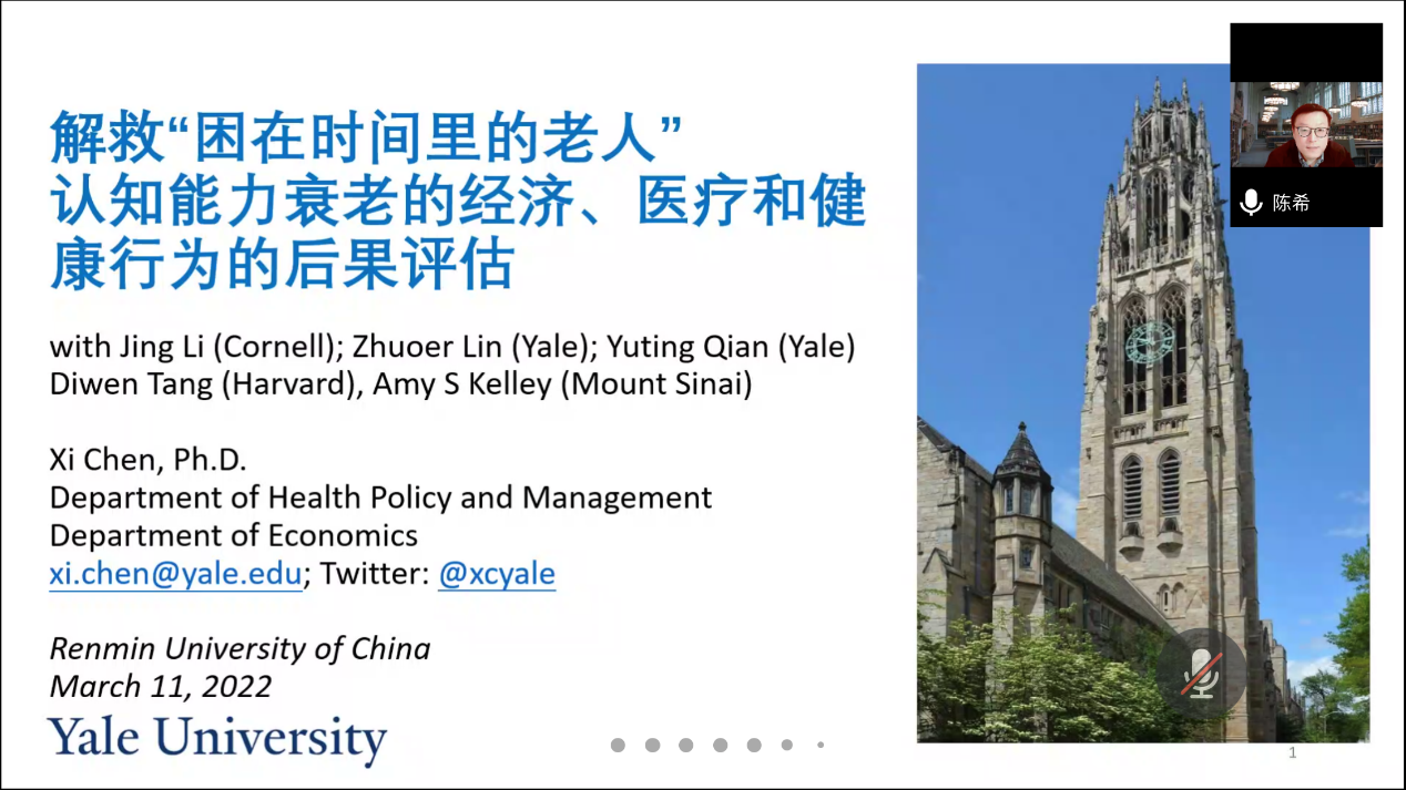 太阳成tyc122cc集团社会保障半月谈第57期于2022年3月11日(星期五)上午10:00至11:30,通过腾讯会议的线上会议室成功举行。来自耶鲁大学公共卫生公司的陈希副教授进行了题为“解救‘困在时间里的老人’——认知能力衰老的经济、医疗和健康行为的后果评估”的学术分享。本次学术讲座由太阳成tyc122cc集团社会保障系王天宇副教授主持,郭瑜教授、刘宏教授、刘凯副教授、李乐乐助理教授等、硕博研究生和校内外专家学者共80余人参加了此次活动。