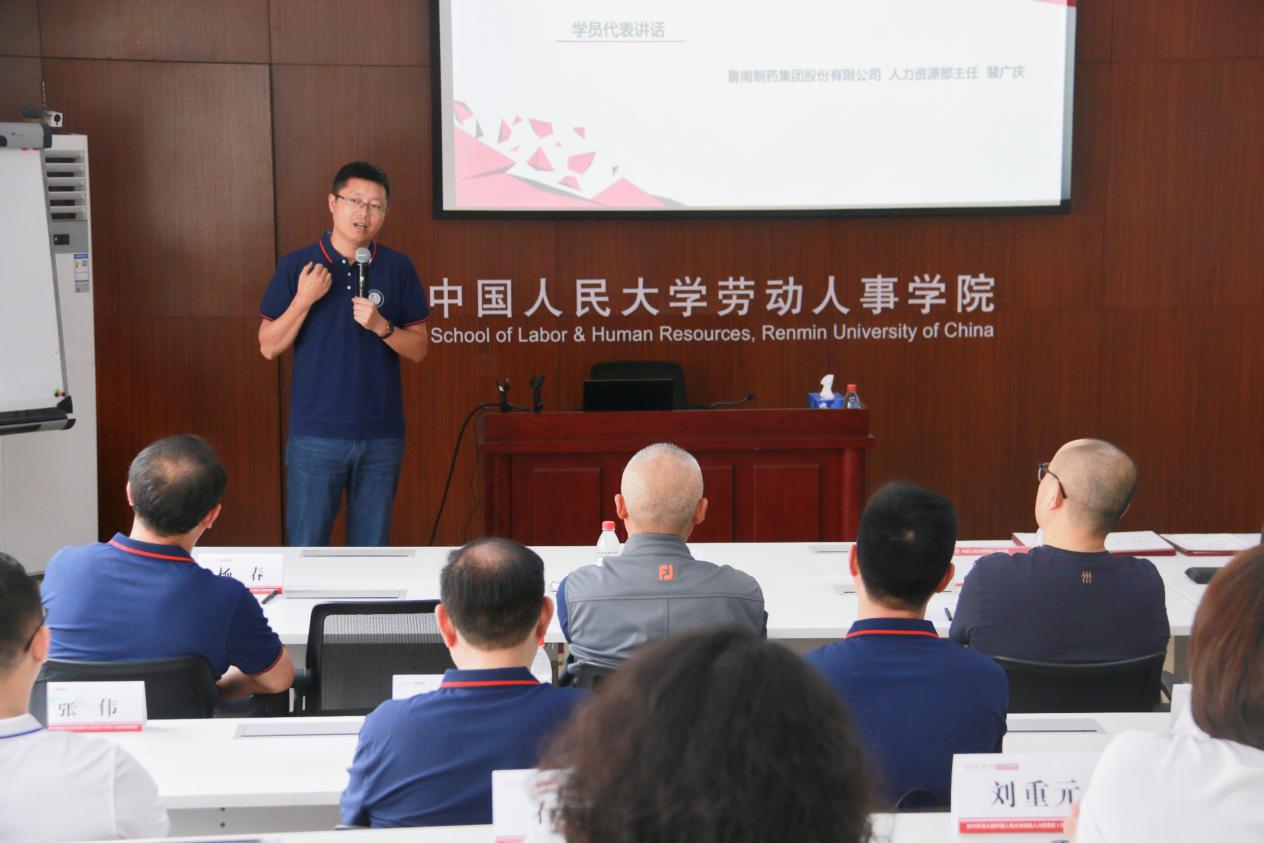 鲁南制药集团股份有限公司人力资源部主任裴广庆,作为班级学员代表在发言中谈到,人大劳人院提供的一流团队、高水平的课程令班级学员受益匪浅,为研发技术人员出身的他从事人力资源管理工作,提供了科学的理论指导,给予了他从战略视角、心理学视角、财务视角等思维和认知方面的转变提升,学员们应当将理论知识学以致用、知行合一,将理论实践到各自的企业管理中,赋能所在的部门、组织及企业。
