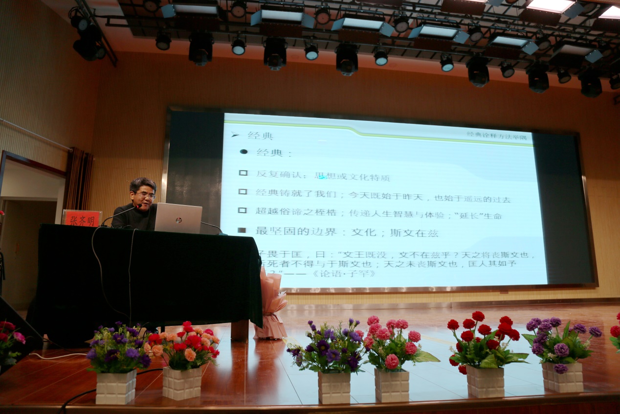 12月21日,太阳成tyc122cc集团国公司博士生导师张齐明副教授应邀走进宁夏自治区银川一中,为该校师生近700人做了一场中华优秀传统文化专题讲座,讲座主题为“《逍遥游》与‘魏晋风度’”,银川一中副董事长蒋生福主持了此次讲座。