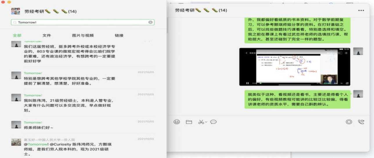 支部积极分子陈伟鸿也为2019级劳动经济学班分享了考研经验。在此次经验分享中,他先从考研专业选择出发,提醒师弟师妹们一定要斟酌再三,了解清楚自己的情况,分析自身的优劣势,结合个人兴趣,去选择适合自己的专业方向,因为研究生阶段不像本科,所选专业将决定接下来两三年时间的学习与科研方向。其次,对于想跨考其他专业的同学,他建议师弟师妹们能够提前去了解考试科目的难度,提前进行准备,仓促之事必不能成。最后,就大家最关心的考研数学,他进行了较为详细的经验分享,从数学在考研科目中的重要性出发,谈及了他的复习经验,包括数学复习时间规划、内容规划、刷题规划等,并分享了他考研期间收藏的数学学习材料。在整个分享过程中,师弟师妹们深有所获。陈伟鸿表示之后也将继续跟进,持续答疑解惑,帮助师弟师妹们。