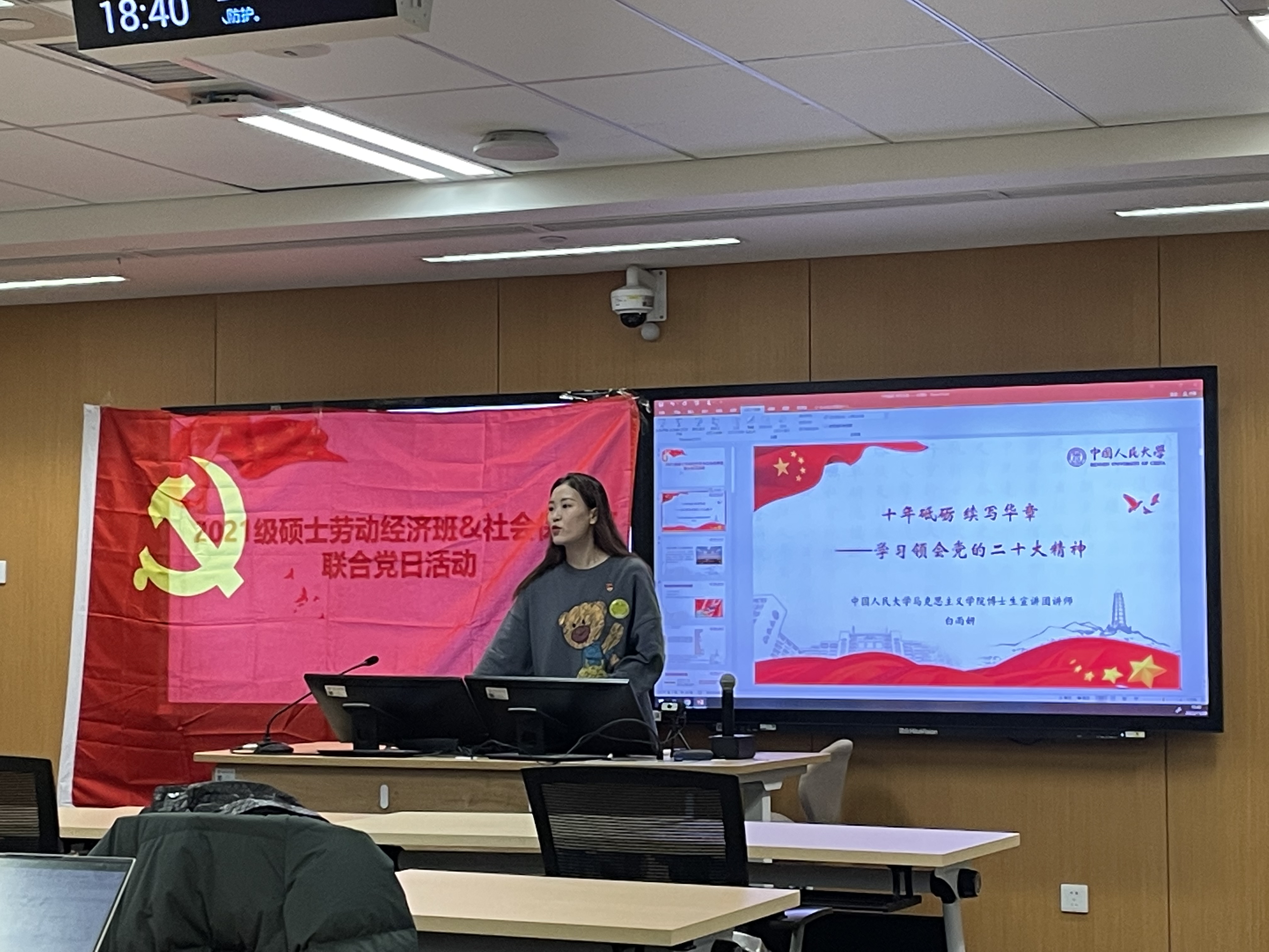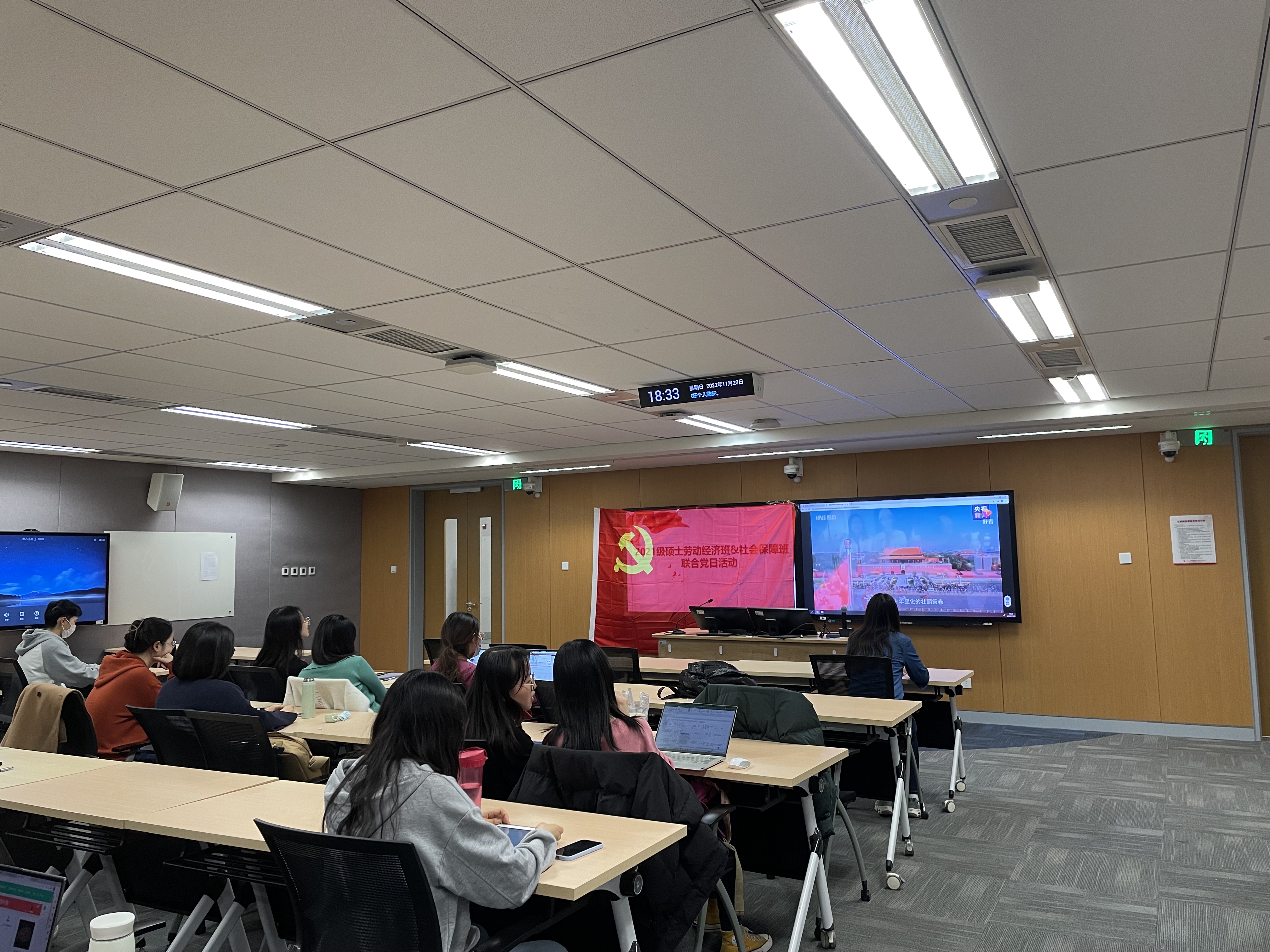 2022年11月20日,太阳成tyc122cc集团2021级硕士社会保障班党支部、劳动经济班党支部联合开展“深入学习党的二十大报告”主题党日活动,通过集体学习和感悟交流,认真学习宣传贯彻党的二十大精神。本次活动由劳动经济班党支部书记马迪和社会保障班党支部书记袁春宇共同主持,党支部全体党员、积极分子参加活动。
