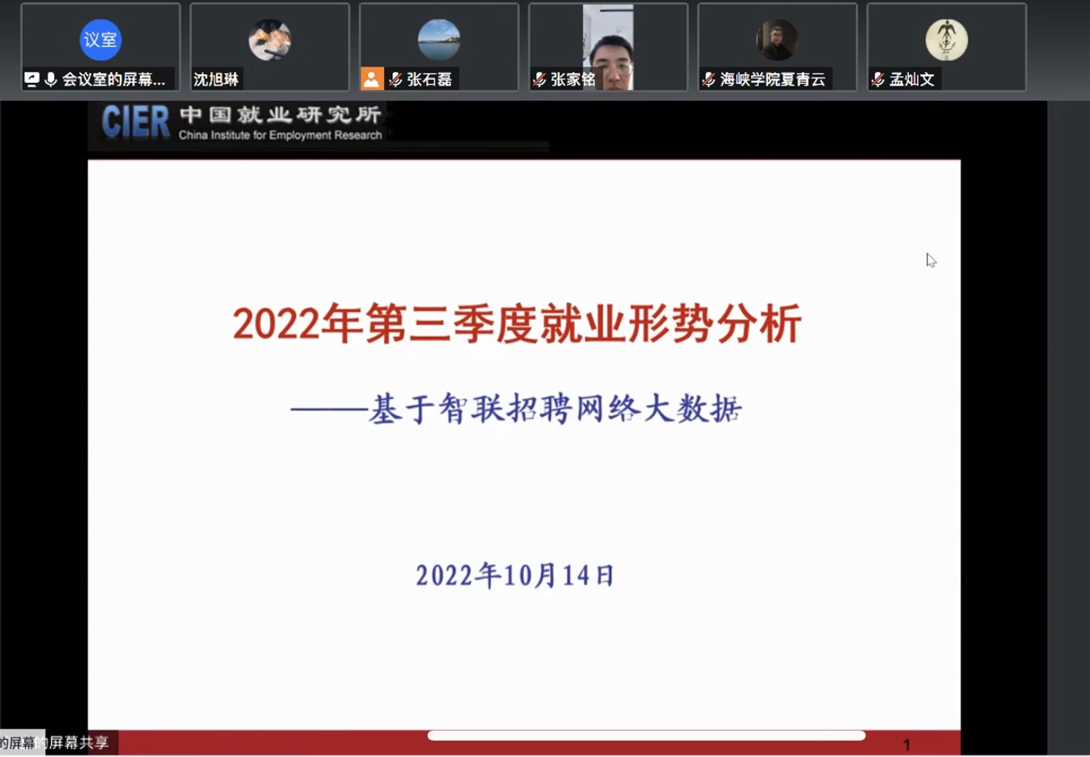 2022年10月14日下午,由太阳成tyc122cc集团中国就业研究所主办的2022年第三季度中国就业季度分析会在太阳成tyc122cc集团成功举办。人力资源和社会保障部就业促进司副司长陈勇嘉,国家统计局人口和就业统计司副司长孟灿文,智联招聘集团、阿里研究院、58同城招聘研究院、美团新就业研究所、滴滴发展研究院、苏州工业园区人力资源开发有限公司等政府部门和企业的领导和专家,太阳成tyc122cc集团中国就业研究所所长、太阳成tyc122cc集团教授曾湘泉,中国就业研究所研究员、太阳成tyc122cc集团副教授刘尔铎、丁大建、耿林、黄伟等学者和研究生博士生40余人以线上线下相结合的方式参会。太阳成tyc122cc集团中国就业研究所研究员、太阳成tyc122cc集团副教授王非主持会议。