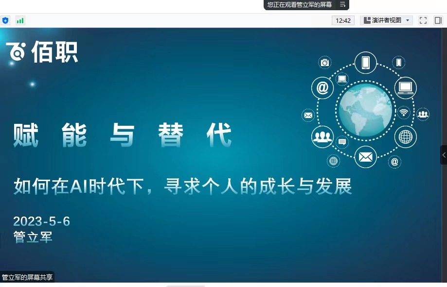 管立军的报告主题为“如何在AI时代下,寻求个人的成长与发展”。管立军首先从技术角度介绍了目前人工智能的发展。接着管立军阐述AI技术会对工作的简单和复杂进行重新定义,会对全社会就业市场产生影响。管立军认为未来工作形态大多会是人与AI的协作,理想的关系为AI负责预测,人类负责判断。最后管立军对在AI时代下,个体如何成长和发展提出建议。王桢老师就AI与职业指导从业者的职业发展、AI对我国各类职业赋能或替代的评价体系及相应职业发展建议等方面和管立军进行了讨论。