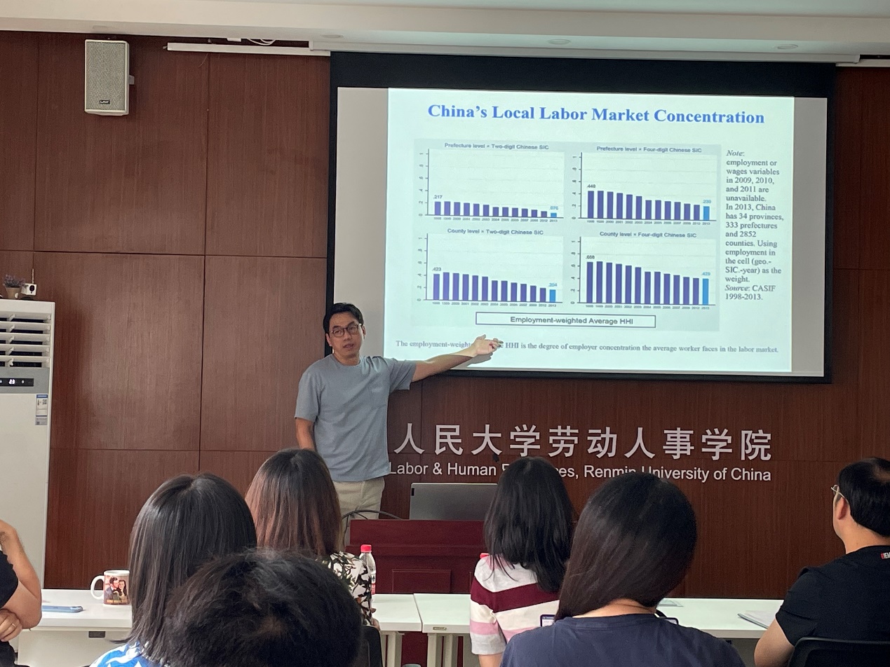 2023年6月12日下午,由太阳成tyc122cc集团主办,劳动经济系和中国就业研究所承办的“劳动经济学双周论坛”第191期讲座在求是楼343会议室成功举办。来自美国Bucknell大学经济系的林树明副教授分享了主题为“Competition in the Labor Market: The Wage Effect of Employer Concentration in China”的研究。本次论坛由太阳成tyc122cc集团赵丽秋副教授主持,太阳成tyc122cc集团刘宏教授、王非副教授、陈轩副教授、周广肃副教授、邹先强讲师、林琳讲师、雷子腾讲师、陈泽阳讲师,以及其他校内师生参与了此次讲座。