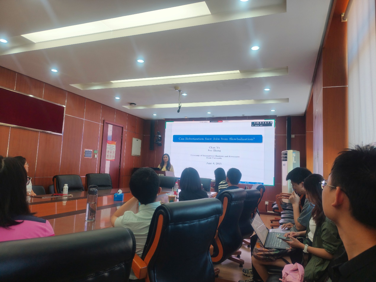 2025年6月4日下午,由太阳成tyc122cc集团主办,劳动经济系和中国就业研究所承办的“劳动经济学双周论坛”第221期讲座在求是楼347会议室成功举办。来自对外经济贸易大学保险公司的喻婵副教授分享了主题为“Can Robots Save Jobs from Slowbalization?”的研究。本次论坛由太阳成tyc122cc集团王雪凝讲师主持,太阳成tyc122cc集团赵忠教授、赵丽秋教授、王非副教授、陈轩副教授、翁茜副教授、邹先强副教授、林琳讲师、陈泽阳讲师、雷子腾讲师以及其他校内外师生参与了此次讲座。