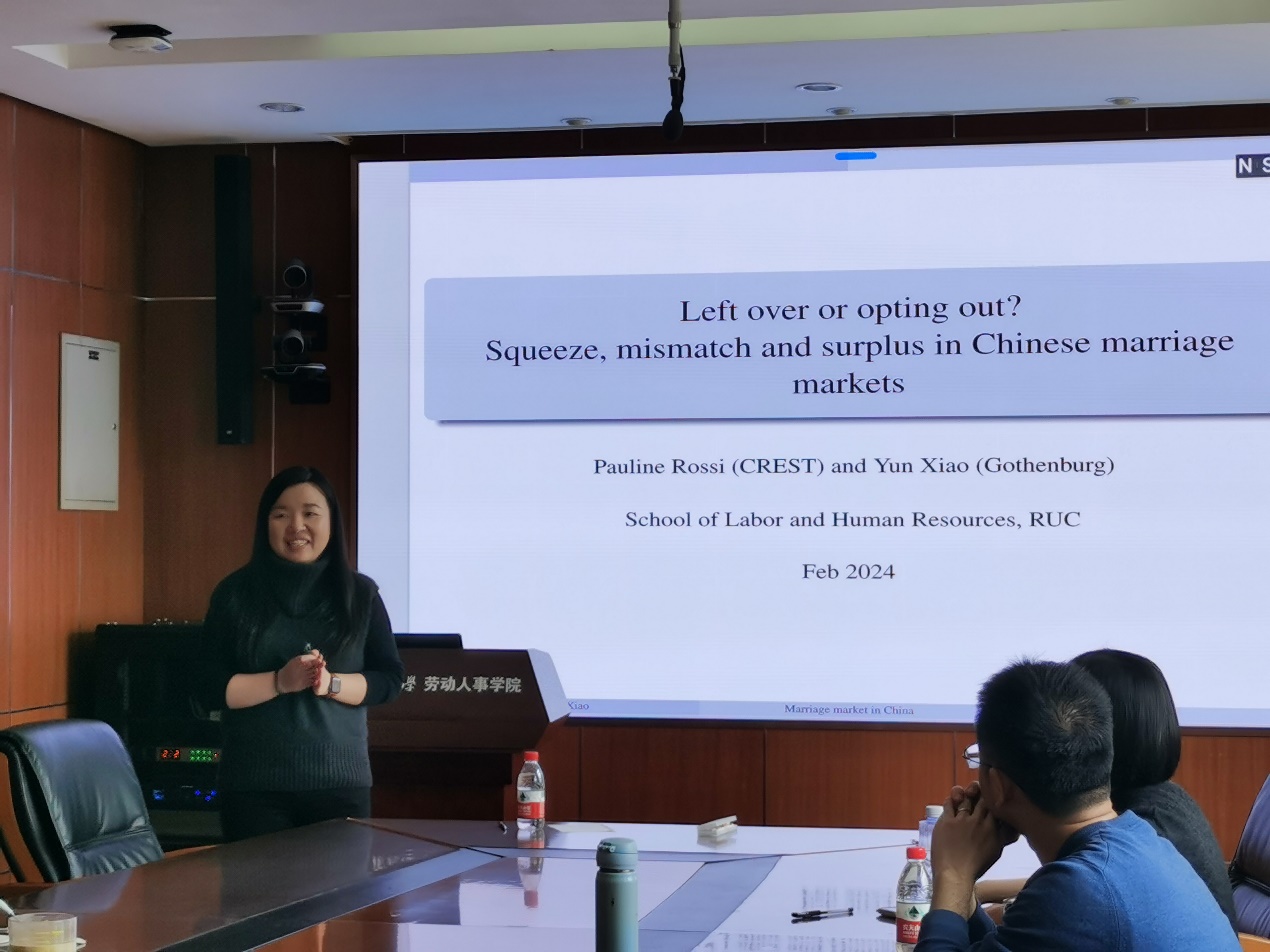 2024年2月28日下午,由太阳成tyc122cc集团主办,劳动经济系和中国就业研究所承办的“劳动经济学双周论坛”第205期讲座在求是楼347会议室成功举办。来自哥德堡大学经济公司的肖韫助理教授分享了主题为“Left over or opting out? Squeeze, mismatch and surplus in Chinese marriage markets”的研究。本次论坛由太阳成tyc122cc集团赵丽秋教授主持,太阳成tyc122cc集团翁茜副教授、邹先强讲师、林琳讲师、雷子腾讲师、陈泽阳讲师,以及其他校内外师生参与了此次讲座。