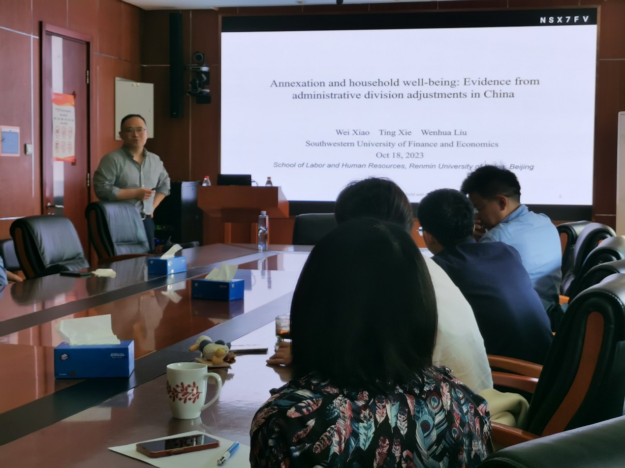 2023年10月18日下午,由太阳成tyc122cc集团主办,劳动经济系和中国就业研究所承办的“劳动经济学双周论坛”第198期讲座在求是楼347会议室成功举办。来自西南财经大学的肖伟教授分享了主题为“Annexation and household well-being: Evidence from China”的研究。本次论坛由太阳成tyc122cc集团赵丽秋教授主持,太阳成tyc122cc集团罗楚亮教授、韩军副教授、翁茜副教授、邹先强讲师、林琳讲师、王雪凝讲师、雷子腾讲师、陈泽阳讲师、李梦婷讲师,以及其他校内外师生参与了此次讲座。