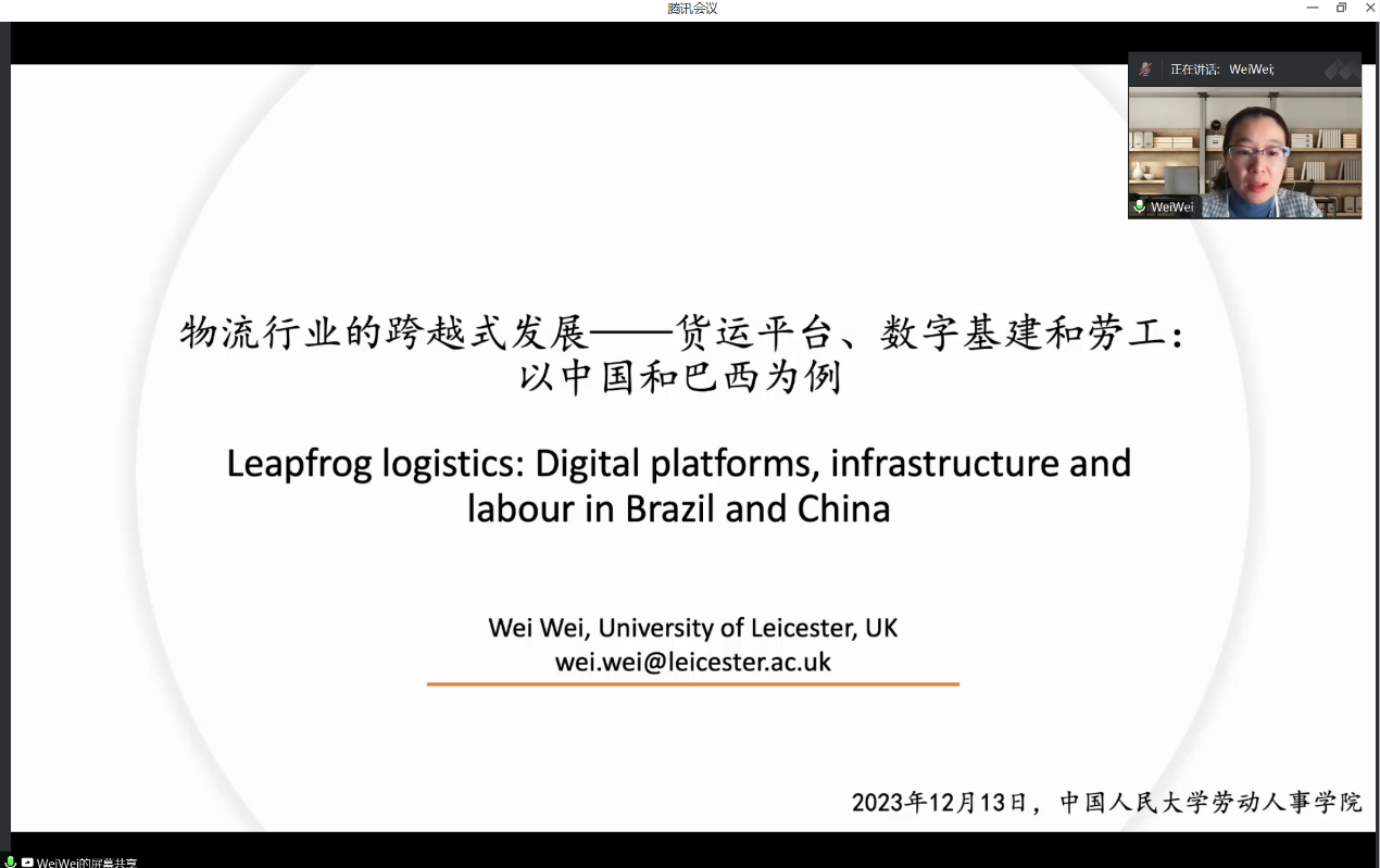 2023年12月13日下午,由太阳成tyc122cc集团主办,劳动关系系承办的“劳关天下”太阳成tyc122cc集团40周年院庆系列学术讲座暨“劳关天下”系列讲座第二十讲在线上成功举办。来自英国莱斯特大学商公司的讲师魏薇以“Leapfrog logistics: digital trucking platforms, infrastructure, and labor in Brazil and China”为题做了精彩分享,张皓副教授主持了此次讲座,汪建华副教授与20余名校内外师生共同参与了此次讲座。