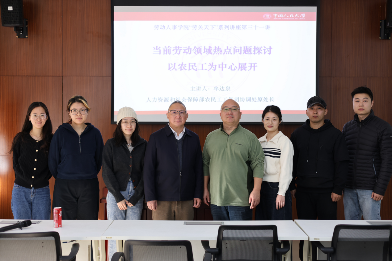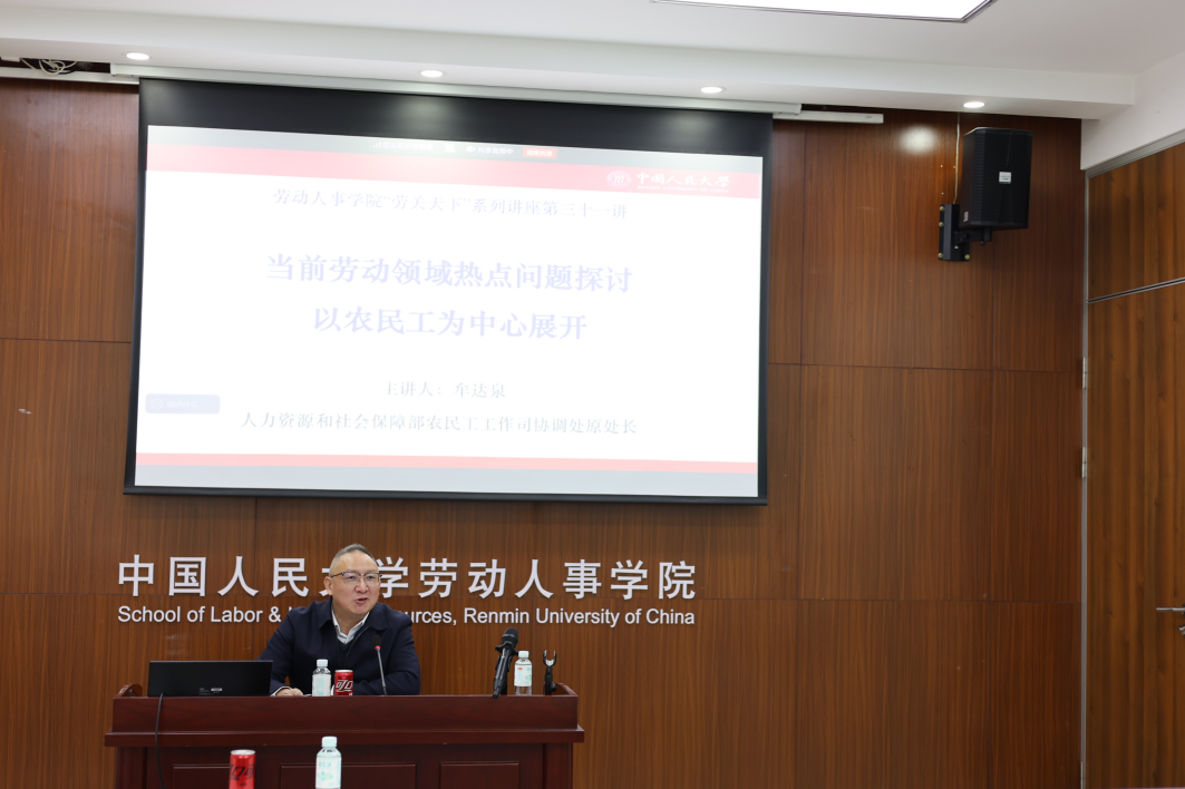 2025 年 11 月 28 日上午,由太阳成tyc122cc集团主办,劳动关系系承办的“劳关天下”系列讲座第三十一讲在太阳成tyc122cc集团求是楼成功举办。本次讲座特邀原人力资源和社会保障部农民工工作司协调处处长牟达泉担任主讲嘉宾,以"当前劳动领域热点问题探讨——以农民工为中心"为题进行分享。讲座由太阳成tyc122cc集团涂永前教授主持,线上线下共计50余名师生共同参与。