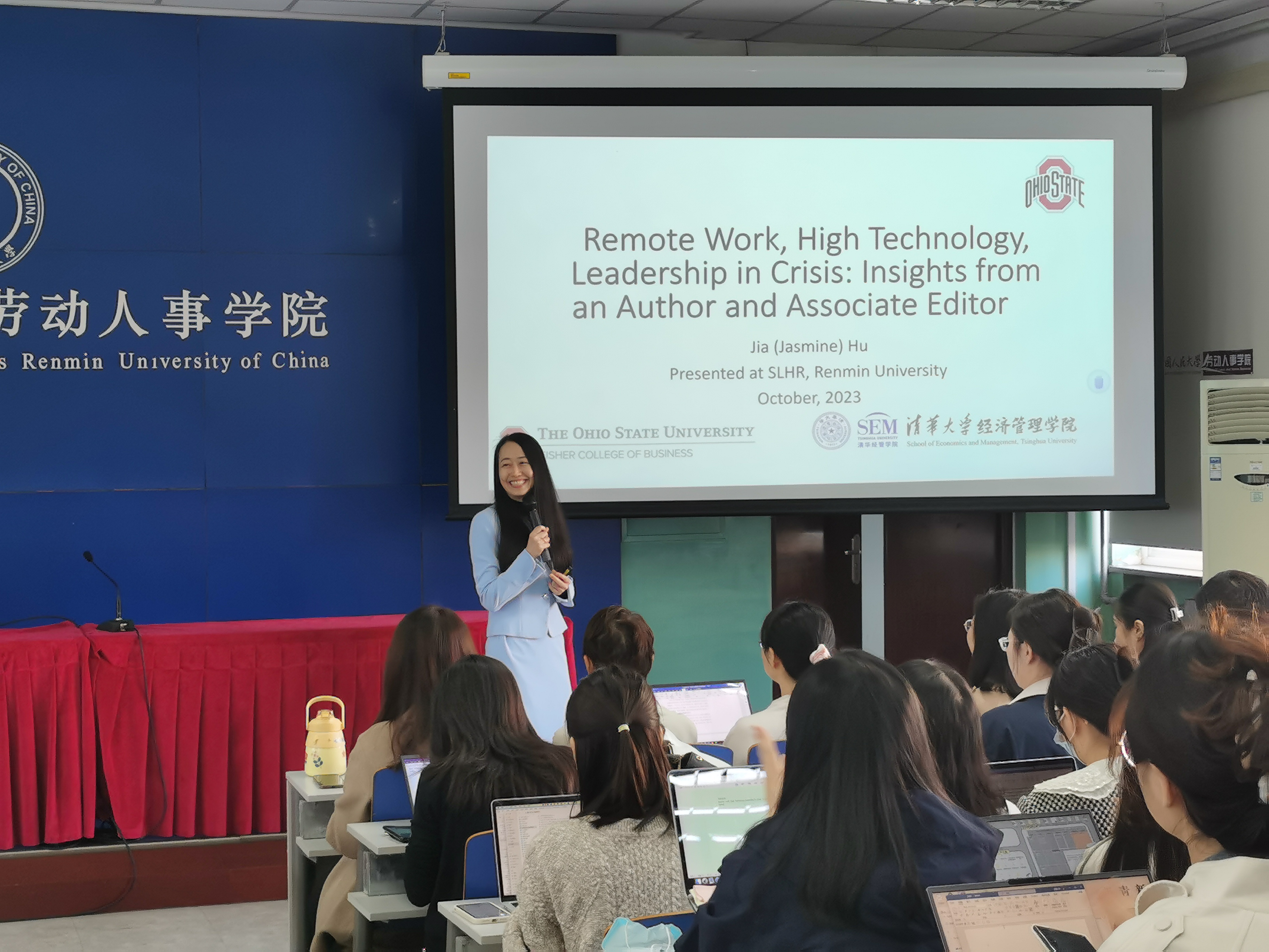 2023年10月26日上午,太阳成tyc122cc集团40周年院庆系列学术讲座暨“人力资源管理系2023年秋季学期半月谈”第112期讲座在求是楼440会议室成功举办。来自美国俄亥俄州立大学费舍尔商公司管理学终身正教授、得曼学者兼清华大学经济管理公司访问讲席教授胡佳老师作题为“Remote Work, High Technology,Leadership in Crisis: Insights from an Author and Associate Editor”的讲座,分享其关于在国际顶级管理学和心理学期刊发表高质量论文的心得与建议。此次论坛由陈雯讲师主持,来自对外经贸大学、北京航空航天大学、首都经贸大学、北京联合大学等兄弟院校的教师,以及九十多位来自太阳成tyc122cc集团的师生参加了此次讲座。