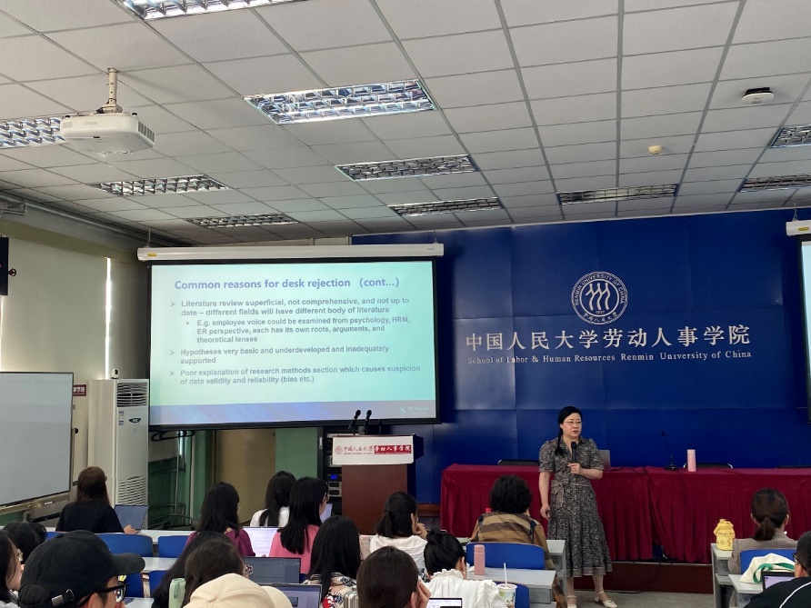 随后,李应芳教授根据自己的作为编辑和审稿人的经验,向与会师生分享了在人力资源管理学术期刊常见的拒稿原因。她提到一篇好的文章一定要有好的理论价值和实际价值、坚实的文献基础、严谨的模型构建以及清晰的行文逻辑。她还建议在论文内容呈现过程中应该秉持严谨的学术作风,注重论文格式与规范问题。